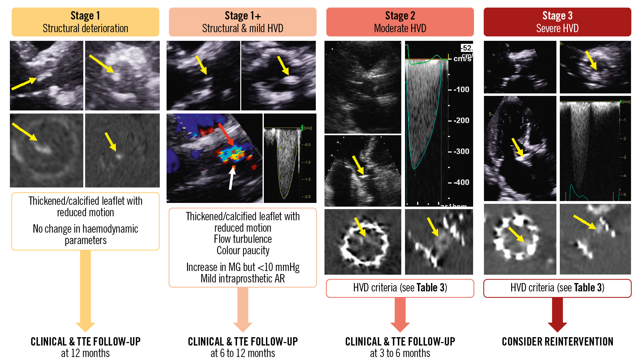Figure 3. Representative examples of the different stages of bioprosthetic valve dysfunction and proposed management. Yellow arrows indicate valve thickening and reduced motion; red arrow: colour Doppler flow restriction and turbulence; white arrow: colour Doppler flow paucity. AR: aortic regurgitation; HVD: haemodynamic valve deterioration; MG: mean gradient; TTE: transthoracic echocardiography