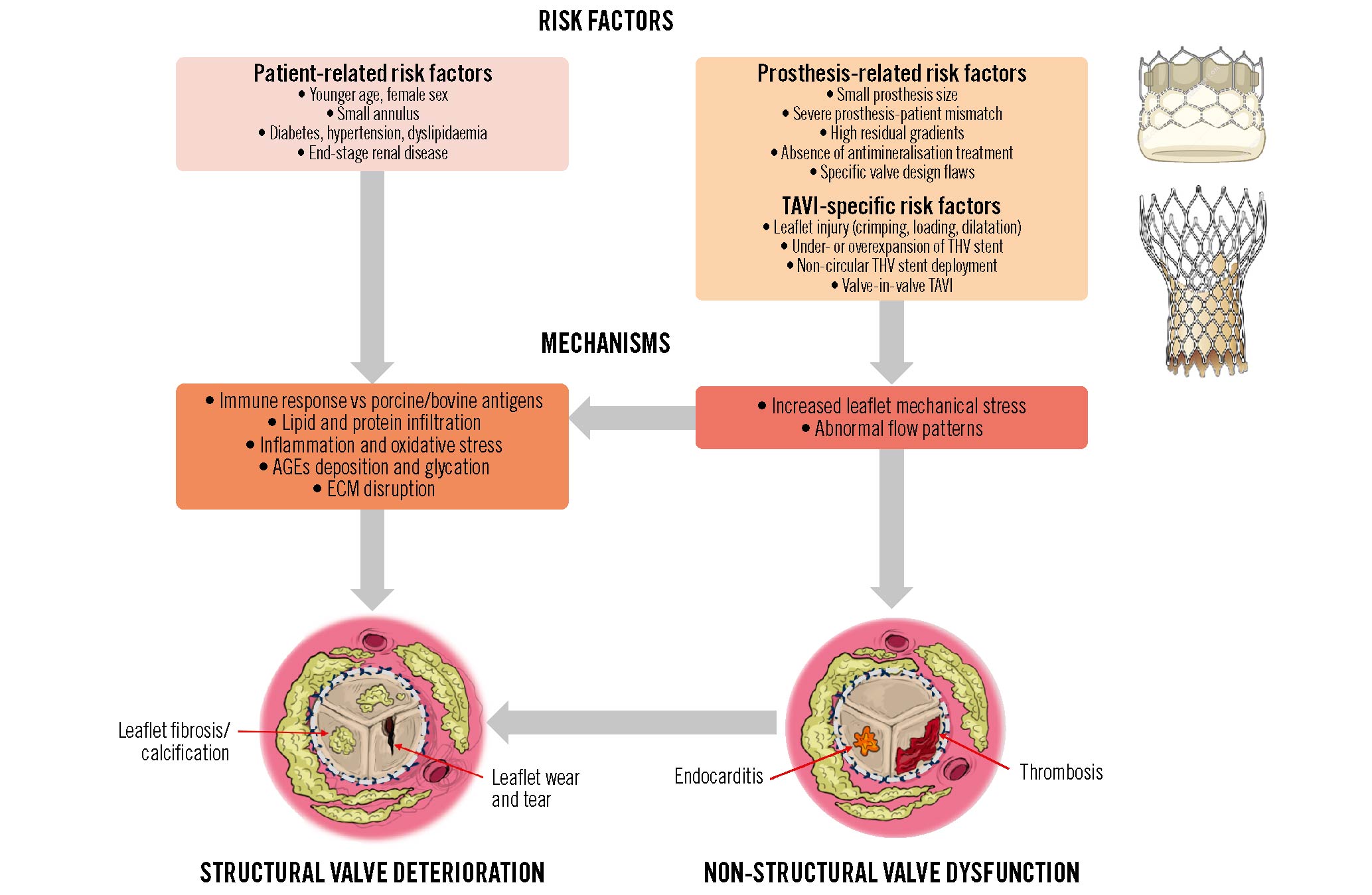 Figure 4. Risk factors and mechanisms of structural valve deterioration and failure. AGEs: advanced glycation end products; ECM: extracellular matrix; TAVI; transcatheter aortic valve implantation; THV: transcatheter heart valve