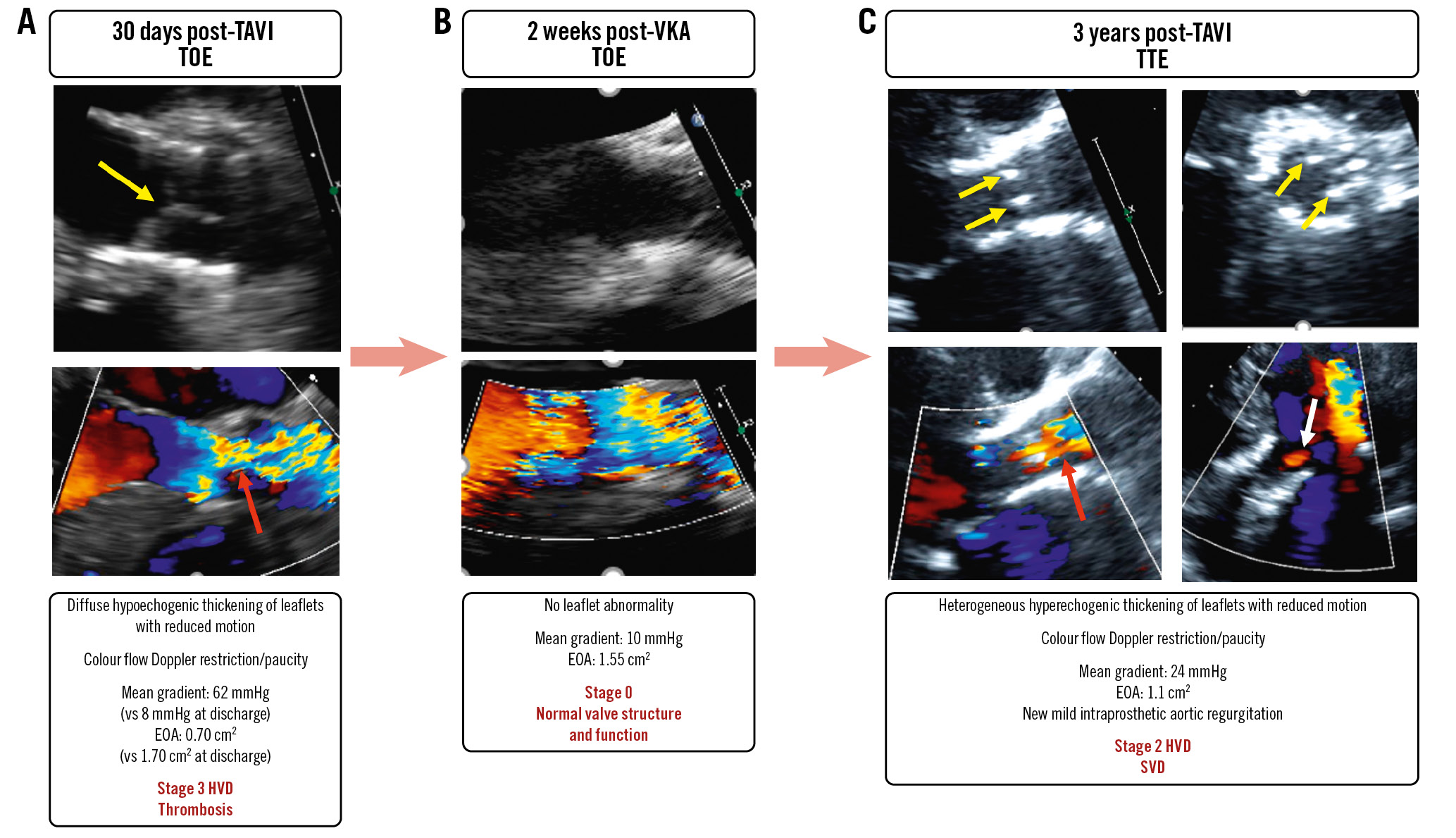 Figure 5. A case of early valve thrombosis followed by accelerated structural valve deterioration. A female patient aged 73 years underwent TAVI with a SAPIEN XT 23 mm. At 30 days, she presented with clinical valve thrombosis resulting in severe (Stage 3 HVD) bioprosthetic valve stenosis (A). There was a quasi-complete resolution of the valve thrombosis and stenosis following 2 weeks of VKA treatment (B). However, 3 years later there was evidence of structural valve deterioration resulting in moderate (Stage 2 HVD) bioprosthetic valve stenosis (C). Yellow arrows indicate valve thickening and reduced motion; red arrows: colour Doppler flow restriction/paucity; white arrow: intraprosthetic aortic regurgitation (AR). EOA: effective orifice area; HVD: haemodynamic valve deterioration; SVD: structural valve deterioration; TAVI: transcatheter aortic valve implantation; TOE: transoesophageal echocardiography; TTE: transthoracic echocardiography; VKA: vitamin K antagonist