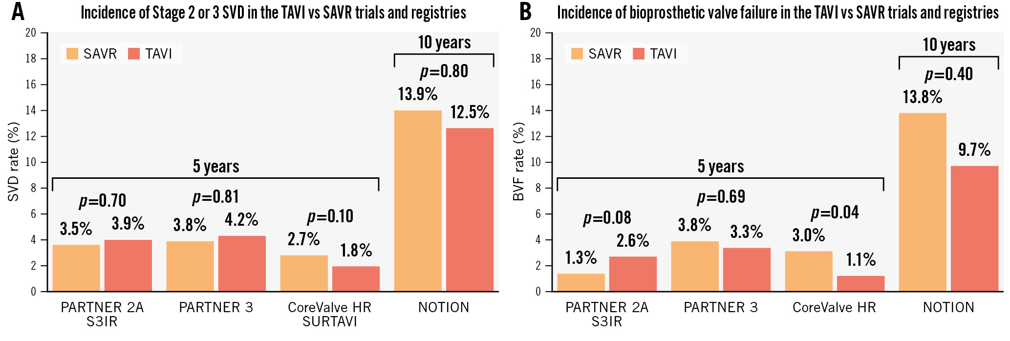 Figure 6. Incidence of Stage 2 or 3 SVD or of all-cause BVF according to VARC-3 in the TAVI versus SAVR RCTs and registries. Incidence of Stage 2 (moderate) or 3 (severe) SVD (A) and of all-cause BVF (B) according to VARC-3 definitions in the PARTNER 2A Trial and S3IR, PARTNER 3 Trial, CoreValve HR trial and SURTAVI Trial at 5 years and in the NOTION trial at 10 years. BVF: bioprosthetic valve failure; CoreValve HR: Medtronic CoreValve U.S. Pivotal Trial; RCT: randomised controlled trial; SAVR: surgical aortic valve replacement; SVD: structural valve deterioration; TAVI: transcatheter aortic valve implantation; VARC-3: Valve Academic Research Consortium 3