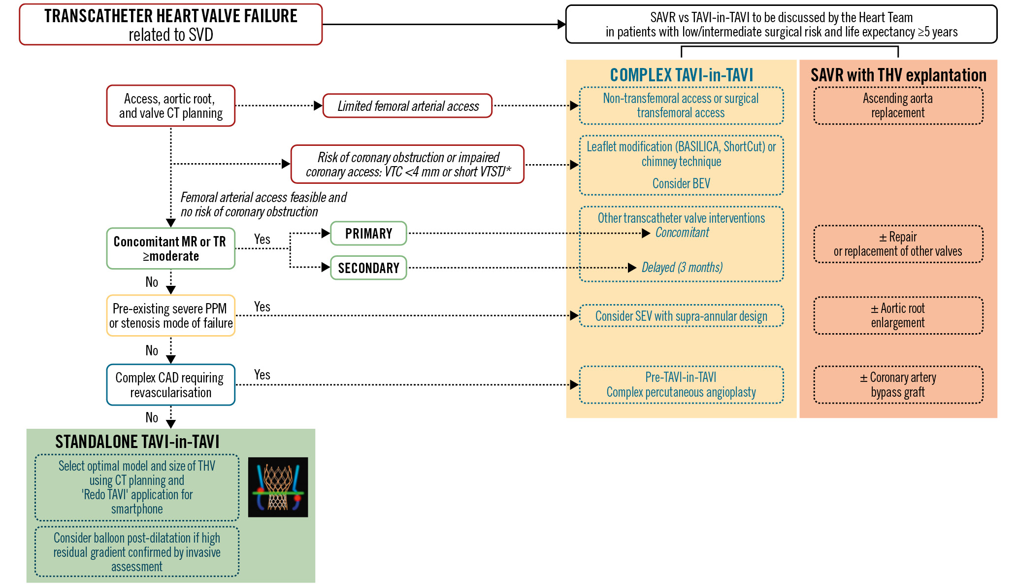 Figure 7. Management of structural THV failure. In a patient with transcatheter heart valve failure related to SVD and low-to-intermediate surgical risk, the first step is to discuss the case among the Heart Team in order to select standalone TAVI-in-TAVI, complex TAVI-in-TAVI, or SAVR with THV explantation. Arguments in favour of SAVR are if the patient requires ascending aorta replacement, aortic root enlargement, a repair or replacement of another valve, and/or coronary artery bypass grafting. If TAVI-in-TAVI is considered the preferred option, the next step is to assess the arterial access, the failed THV, the aortic root and the coronary ostia using CT imaging and planning. If there is limited or impossible femoral arterial access, non-transfemoral or surgical transfemoral access should be considered. If there is a risk of coronary obstruction or of impaired coronary access for future percutaneous coronary intervention as identified by a VTC <4 mm and/or a short VTSTJ, leaflet modification or the chimney technique should be considered, and a BEV may be preferable for the TAVI-in-TAVI. If femoral access is feasible and there is no risk of coronary obstruction, the next step is to assess the presence and aetiology (primary vs secondary) of significant MR or TR. If ≥moderate primary MR or TR is present, concomitant transcatheter interventions may be considered. If the MR or TR is secondary, it is preferable to consider a staged approach with standalone TAVI-in-TAVI first, and then the mitral and/or tricuspid transcatheter intervention 3 months later if the MR and/or TR and heart failure symptoms still persist. If pre-existing severe PPM of the failed THV and/or if severe THV stenosis are present, a SEV with supra-annular design should be considered for the TAVI-in-TAVI. In the presence of complex CAD requiring revascularisation, complex percutaneous angioplasty should be considered prior to the TAVI-in-TAVI procedure. The application ‘Redo TAVI’ (KRUTSCH Associates) can be used to select the optimal model and size of THV for the TAVI-in-TAVI. If a high residual gradient (mean gradient >20 mmHg), confirmed by invasive assessment, is present following the TAVI-in-TAVI procedure, a balloon post-dilatation may be considered. *VTSTJ <2.5 mm is considered high risk and 2.5-3.5 mm intermediate risk for coronary artery obstruction. The schematic representation of the VTC and VTSTJ measurements in a scenario of SEV-in-BEV is reproduced with permission100. BEV: balloon-expandable valve; CAD: coronary artery disease; CT: computed tomography; MR: mitral regurgitation; PPM: prosthesis-patient mismatch; SAVR: surgical aortic valve replacement; SEV: self-expanding valve; SVD: structural valve deterioration; TAVI: transcatheter aortic valve implantation; THV: transcatheter heart valve; TR: tricuspid regurgitation; VTC: virtual THV to coronary artery distance; VTSTJ: virtual THV to sinotubular junction distance