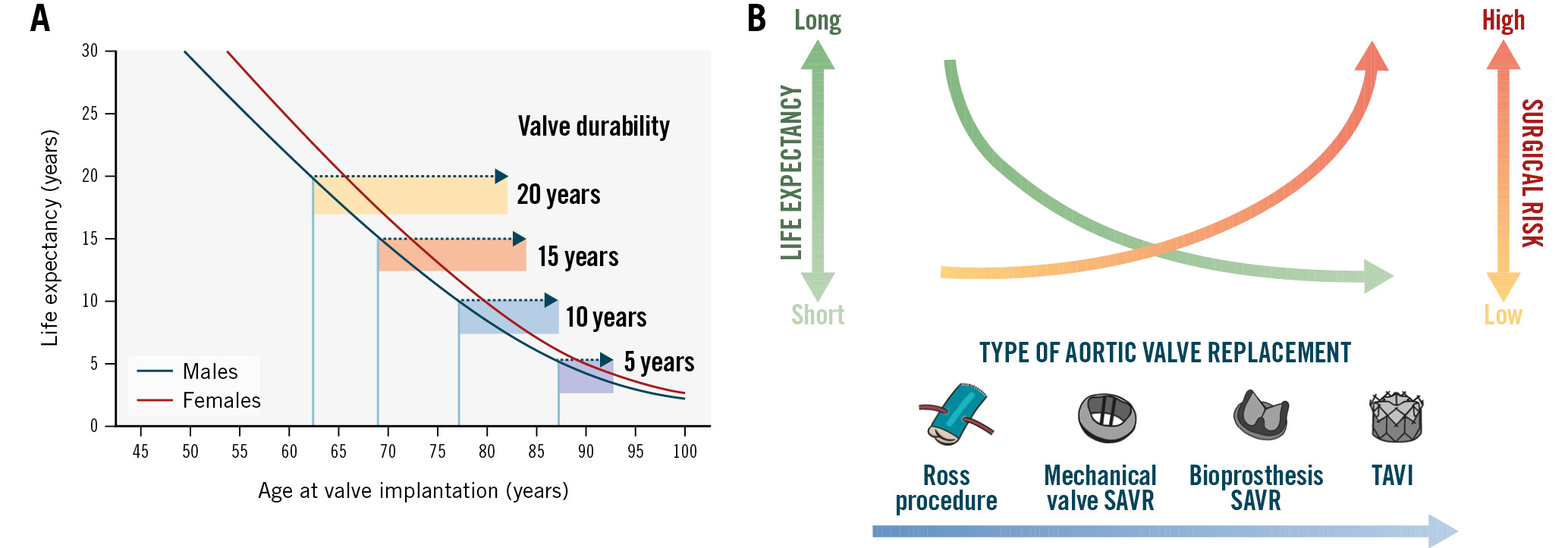 Figure 8. Balancing the patient’s life expectancy, surgical risk, and expected valve durability in the decision between TAVI versus SAVR. (A) Schematic of the ratio between life expectancy and valve durability. Adapted with permission80. (B) Type of AVR according to life expectancy and surgical risk. SAVR: surgical aortic valve replacement; TAVI: transcatheter aortic valve implantation
