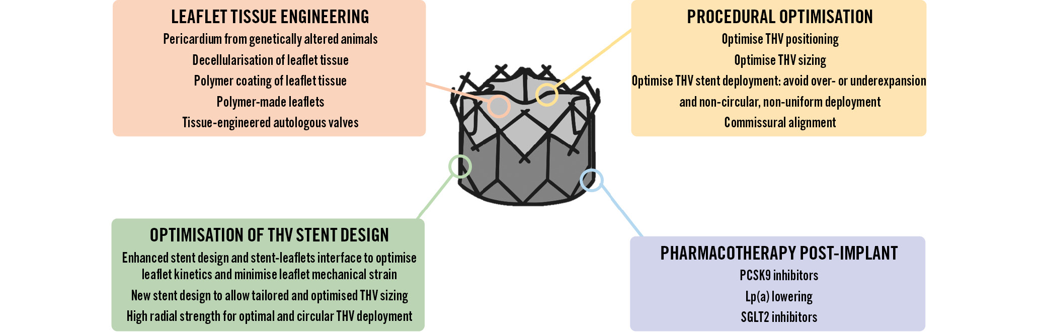 Figure 9. Future directions to optimise THV durability. Lp(a): lipoprotein(a); SGLT2: sodium-glucose cotransporter 2; PCSK9: proprotein convertase subtilisin/hexin type 9; THV: transcatheter heart valve