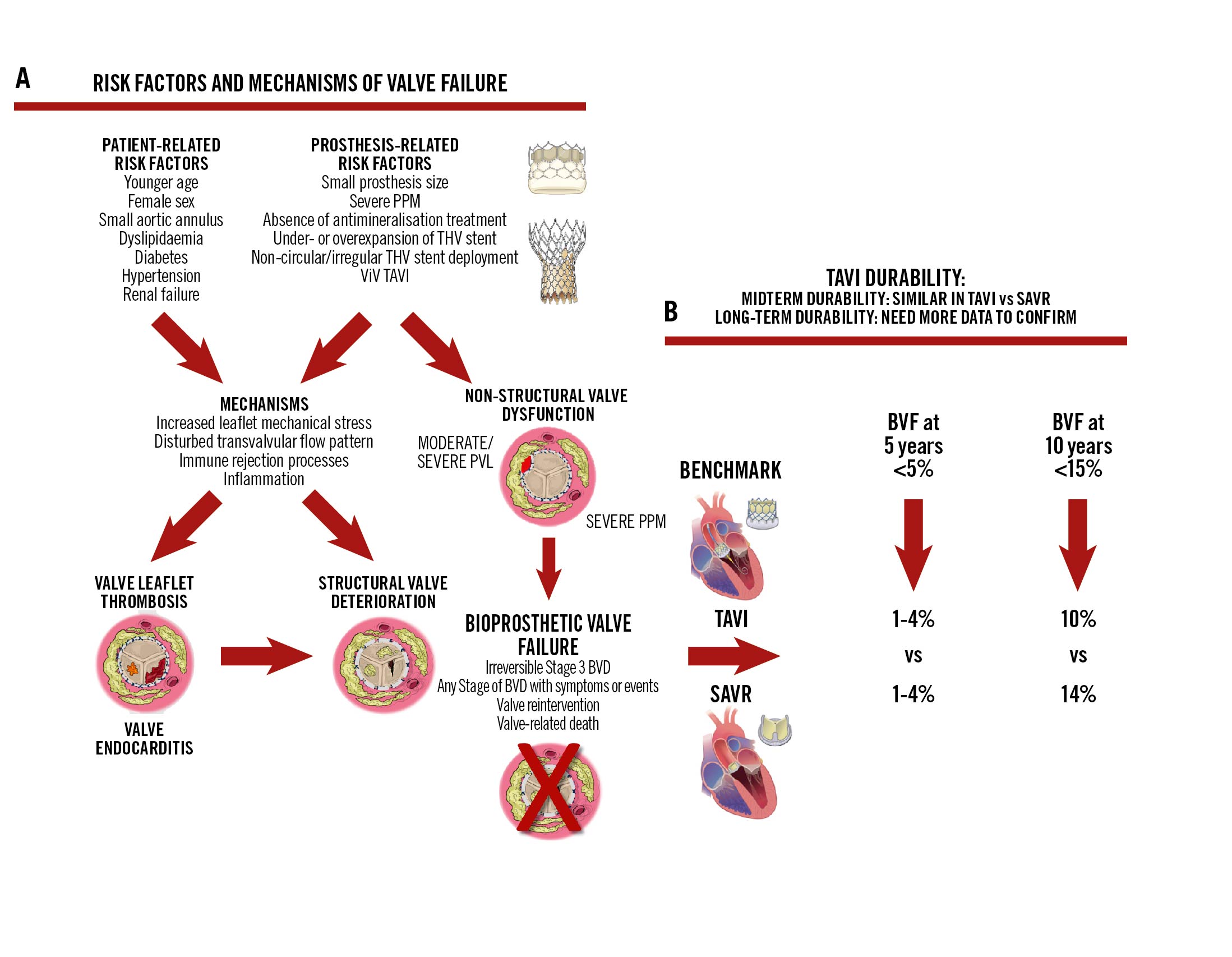 Transcatheter aortic valve implantation (TAVI) is now utilised as a less invasive alternative to surgical aortic valve replacement (SAVR) across the whole spectrum of surgical risk from extreme/high to low surgical risk. Ideally, the proven durability of the bioprosthetic valve should match or exceed the expected life expectancy of the patient. Structural valve deterioration (SVD) is the main factor limiting the durability of the bioprosthetic valves used for TAVI or SAVR. The long-term durability of bioprosthetic valves has become a key goal of TAVI as this procedure is now considered for younger and lower-risk populations with longer life expectancy12. The utilisation of TAVI will likely further extend to even lower-risk populations including patients with asymptomatic severe aortic stenosis or at-risk moderate aortic stenosis. The purpose of this article is thus to present a state-of-the-art overview on the definition, aetiology, risk factors, mechanisms, diagnosis, clinical impact, and management of bioprosthetic valve dysfunction (BVD) and failure (BVF) following TAVI with a comparative perspective versus SAVR (Central illustration).
