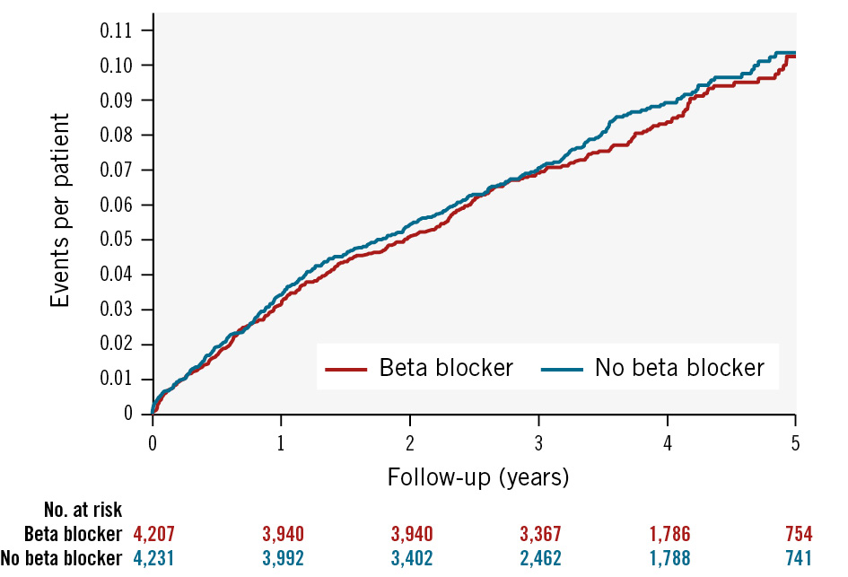 During a median follow-up of 3.7 years, 291 and 282 patients in the beta blocker and control groups, respectively, developed the composite ischaemic endpoint of cardiac death, reinfarction, sustained VT/VF, resuscitated cardiac arrest, or unplanned revascularisation. The total number of events including repetitive episodes were 319 (22.2/1,000 patient-years) and 330 (22.8/1,000 patient-years) in patients randomised to beta blocker or control, respectively (HR 0.98, 95% CI: 0.82-1.16; p=0.78).