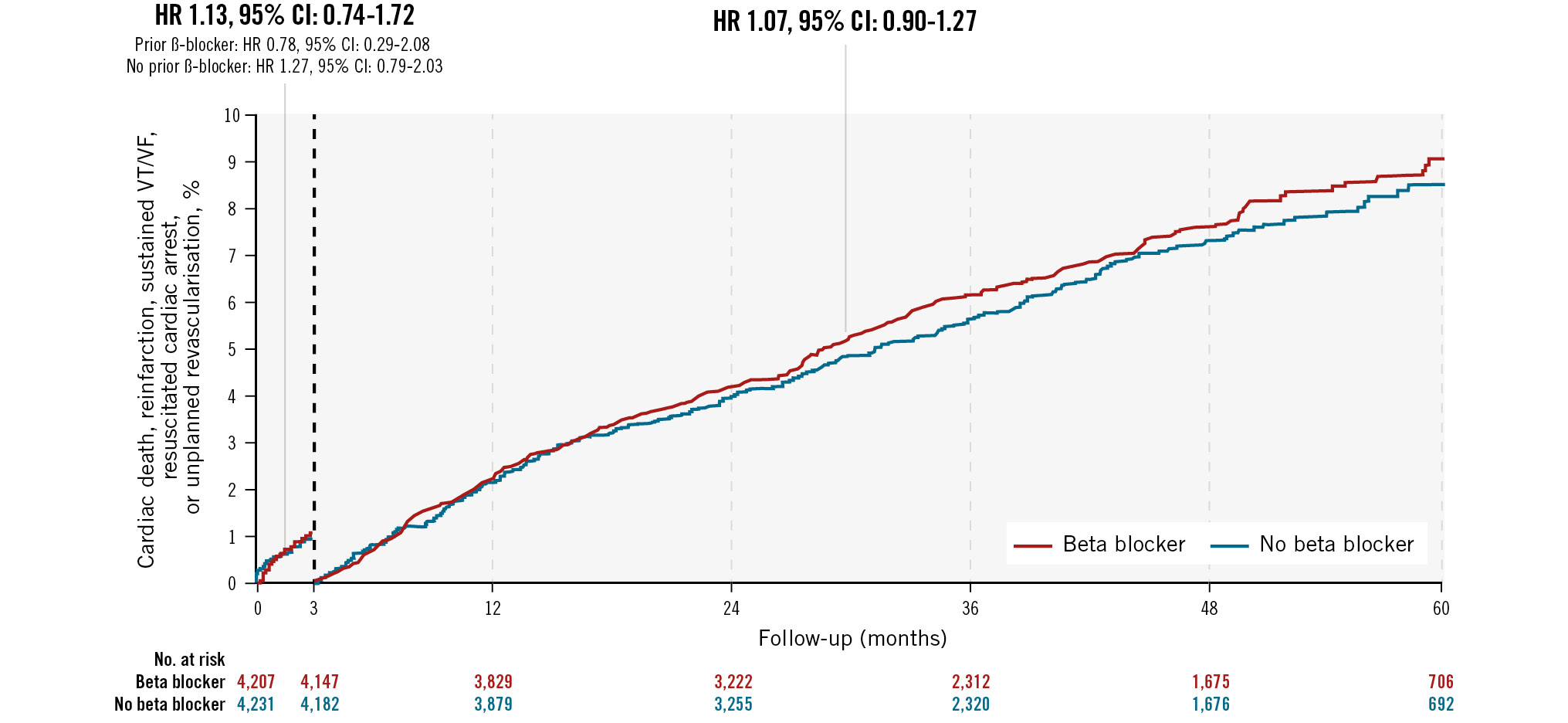 Central illustration. Kaplan-Meier curves for primary endpoint landmark analysis at 3 months Kaplan-Meier plot of the landmark analysis of cardiac death, reinfarction, sustained VT/VF, resuscitated cardiac arrest, or unplanned revascularisation at 3 months. A hazard ratio (HR) below 1 shows a benefit of beta blocker therapy and above 1 shows a benefit of control. CI: confidence interval; VF: ventricular fibrillation; VT: ventricular tachycardia