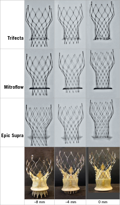 Methods and results: Sizes 23 and 26 mm of the CoreValve were implanted in sizes 19 and 21 mm of three BP models: Trifecta, Mitroflow and Epic Supra. The THV was tested in three positions –normal (manufacturer recommendation), low (4 mm below normal) and high (4 mm above normal)– using a pulse duplicator. Haemodynamics were assessed by Doppler echocardiography and flowmeter, and GOA with a high-speed camera. Higher implantation was associated with lower residual gradients (normal position: –9%, high: –25% versus low). High position was, however, associated with increased risk of regurgitation in the Mitroflow and embolisation in the Epic Supra. Using a 26 mm THV instead of a 23 mm was associated with larger EOAs in the Trifecta, smaller in the Mitroflow, and increased risk of embolisation in the Epic Supra.
