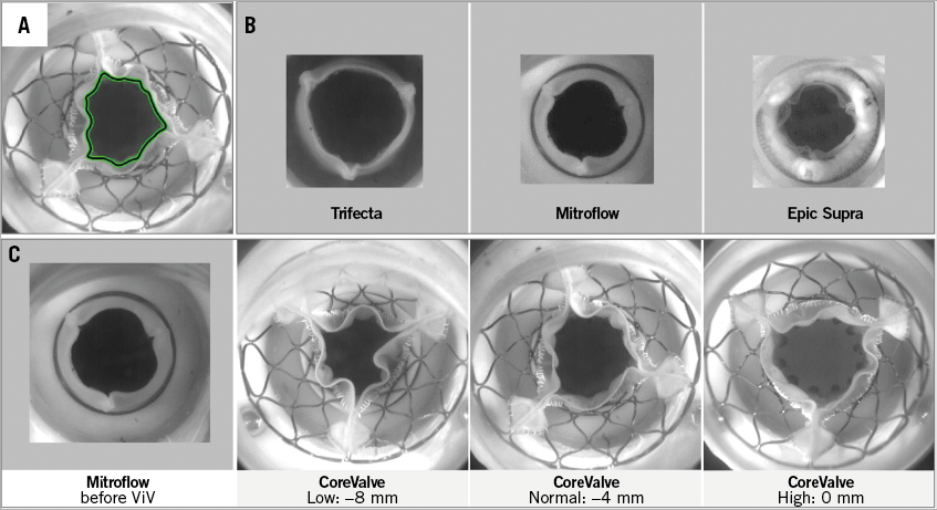 Figure 2. En face views of the aortic valves using a high-speed camera. A) Measurement of the geometric orifice area by drawing the contour of the valve orifice using a MATLAB programme. B) View of the three BP at maximum opening before valve-in-valve (ViV). C) View of the 19 mm Mitroflow before and after ViV implantation of the 23 mm CoreValve deployed at three different implantation depths.