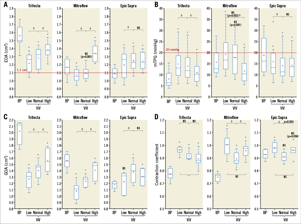 Given that the baseline haemodynamics of the Trifecta are substantially better than those of the Epic Supra or the Mitroflow, the haemodynamics post ViV were similar or better with the Trifecta than with the Epic Supra or the Mitroflow. These findings further emphasise the importance of implanting surgical BP with the largest possible internal orifice diameter, providing the largest GOA and EOA, and also ideally with stents (and thus internal orifice area) able to expand at the time of ViV.