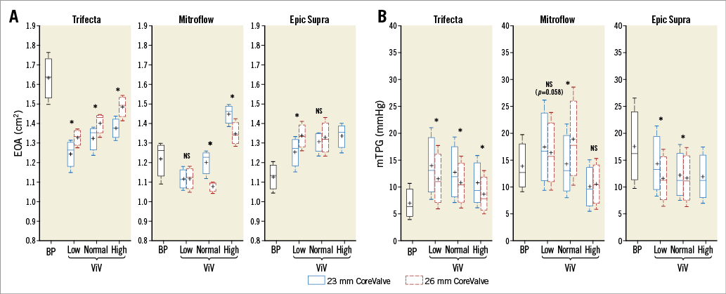 Figure 4. Valve haemodynamic performance according to the model of surgical bioprosthesis and the size and implant depth position of the transcatheter heart valve. A) EOA data. B) mTPG data. For the Epic Supra BP with CoreValve in the high position, only 23 mm CoreValve data are represented because the data for the 26 mm CoreValve are missing due to valve migration. BP: bioprosthesis; NS: not statistically significant; ViV: valve-in-valve