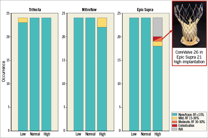 Figure 5. Effect of transcatheter heart valve implantation depth on intervalvular regurgitation and stability for each model of surgical bioprosthesis. One case of valve dislodgement and subsequent moderate intervalvular regurgitation was recorded with the 26 mm CoreValve implanted in the high position within the 21 mm Epic Supra. RF: regurgitant fraction