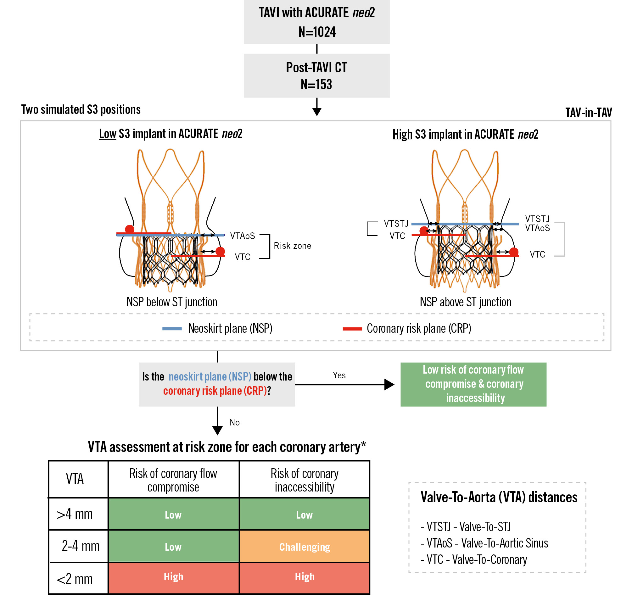 Methods: A total of 153 post-ACn2 TAVI cardiac computed tomography scans were analysed. Redo-TAVI using an S3 was simulated in two positions: S3 outflow to the ACn2 upper crown (low implant) and S3 outflow to the base of the ACn2 commissural posts (high implant). The risk for coronary flow compromise and inaccessibility was determined by the height of the neoskirt created by the pinned back leaflets and the valve-to-aorta distances.