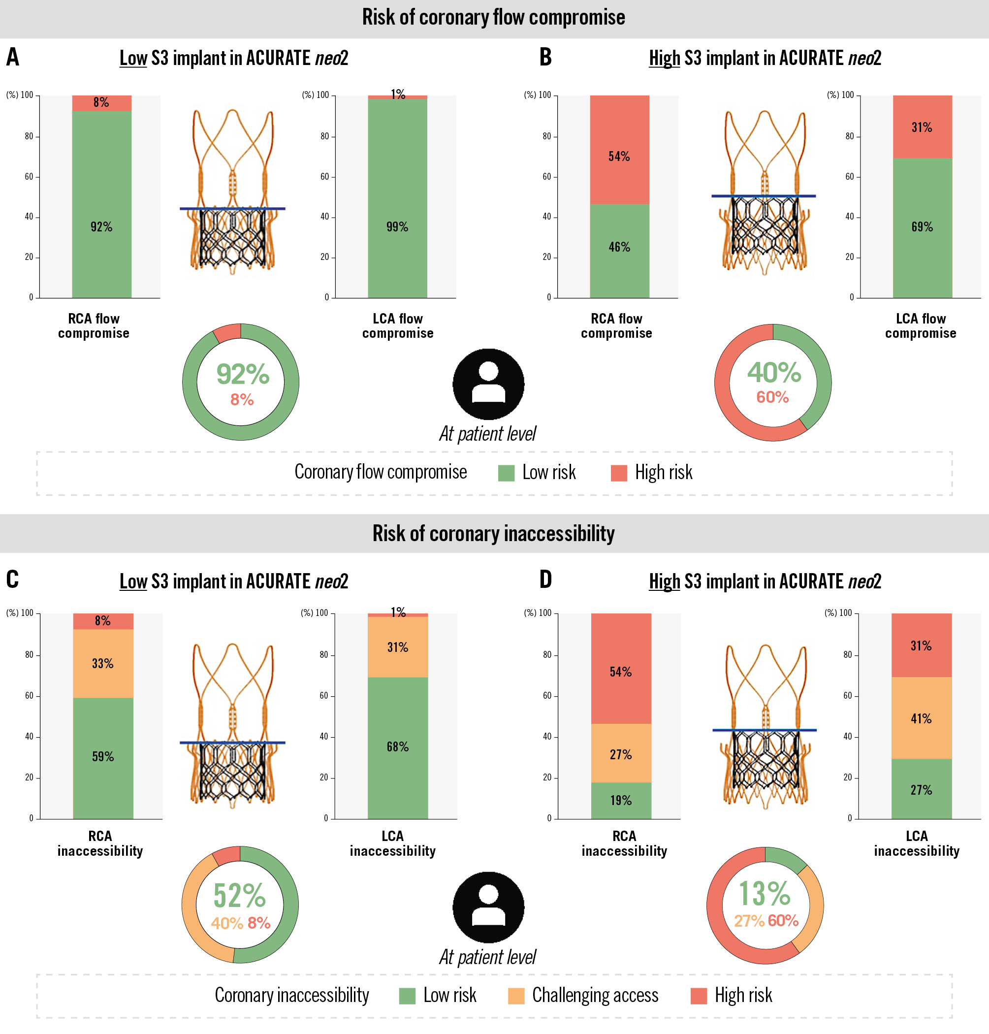 Figure 2. CT-predicted risk of coronary flow compromise and coronary inaccessibility following redo-TAVI with S3-in-ACn2 TAV. A) The risk for coronary flow compromise was low (8%) with a low S3 implant position, aligning with the upper crown of the ACn2 and (B) relatively high (60%) with a high S3 implant position, aligning with the base of the ACn2 commissural posts. Similarly, the risk of a challenging coronary access or coronary inaccessibility was (C) low with a low S3 implant position and (D) higher with a high S3 position. ACn2: ACURATE neo2; CT: computed tomography; LCA: left coronary artery; RCA: right coronary artery; S3: SAPIEN 3; TAV: transcatheter aortic valve; TAVI: transcatheter aortic valve implantation