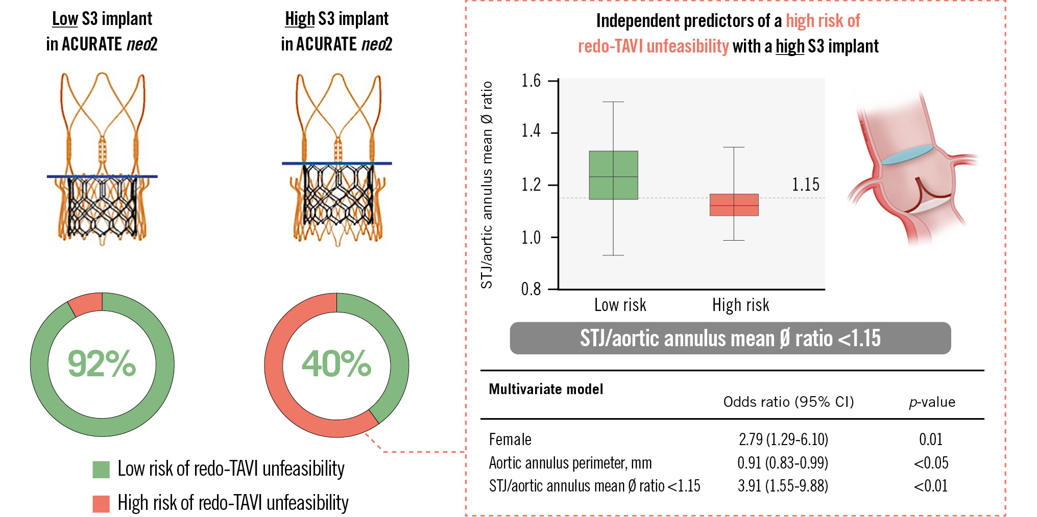 Central illustration. Feasibility of redo-TAVI in ACURATE neo2 valves: a CT analysis. The risk of redo-TAVI unfeasibility is low (8%) in case of a low SAPIEN 3 (S3) implantation in an index ACURATE neo2; this risk increases to 60% in case of a high S3 implant. Independent predictors of a high risk of redo-TAVI unfeasibility in case of a high S3 implant are female sex, a small aortic annulus and an STJ/aortic annulus mean diameter ratio <1.15; the latter variable is the strongest predictor. CI: confidence interval; CT: computed tomography; STJ: sinotubular junction; TAVI: transcatheter aortic valve implantation