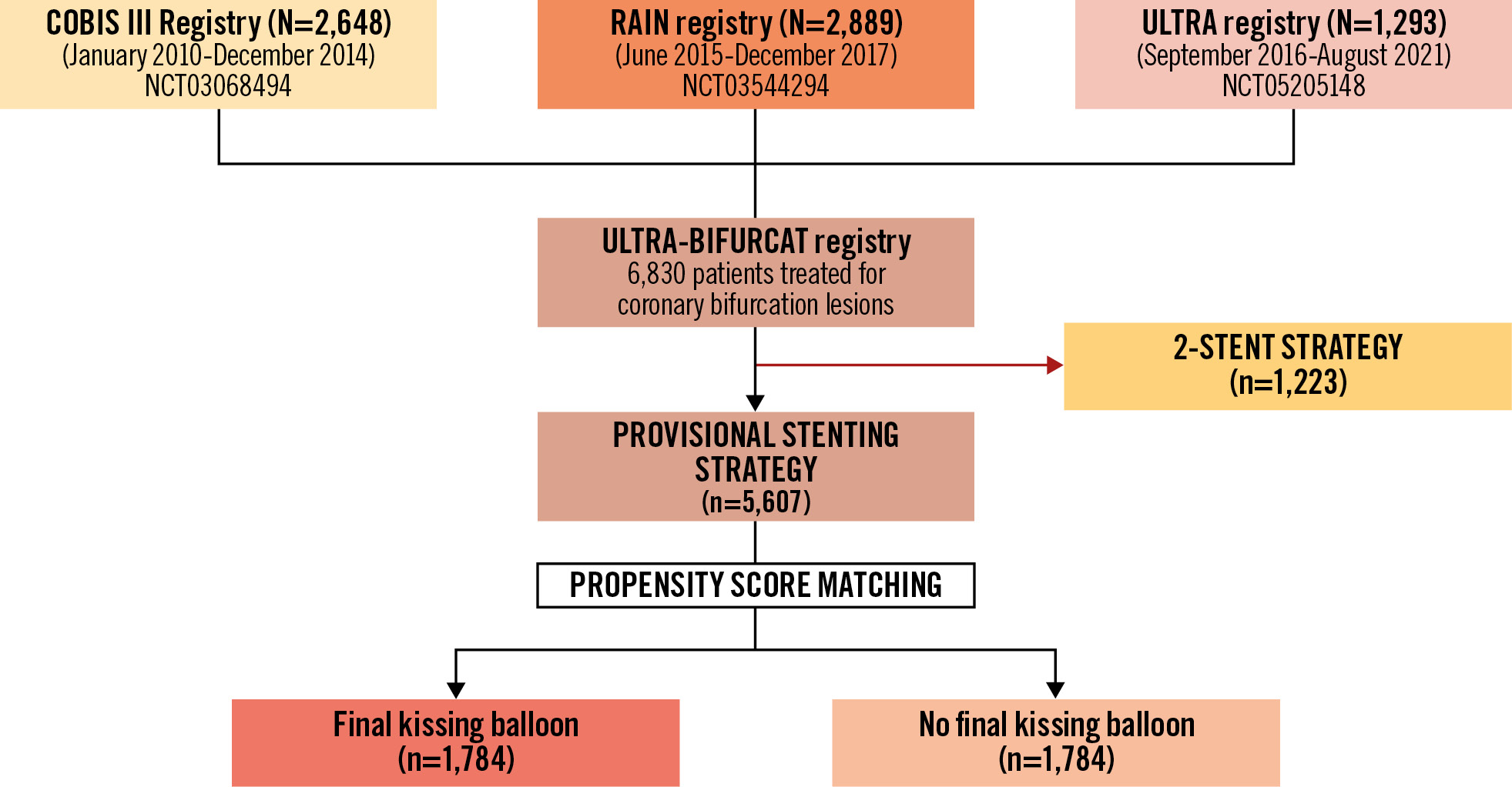 Current interventional cardiology practice suggests provisional stenting as the preferred approach for most coronary bifurcation lesions, with a 2-stent strategy reserved for complex cases. Final kissing balloon inflation (FKB) is often employed to optimise stent apposition and minimise side branch compromise, especially in 2-stent techniques. The results of this multicentre retrospective study, pooling patient-level data from three large registries, offer real-world evidence on the effectiveness of FKB among patients treated with a provisional stenting technique. While FKB did not reduce major adverse cardiac events, it showed promise in reducing lesion-associated adverse outcomes, such as target lesion revascularisation and target vessel myocardial infarction.