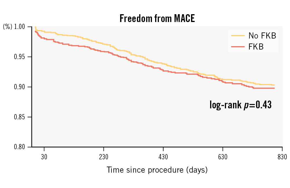 After PSM, there were no significant differences in the primary composite outcome in the FKB and no FKB groups (9.0% vs 8.6%, respectively; p=0.68). Kaplan-Meier curves for the cumulative freedom from MACE are presented in Figure 2.