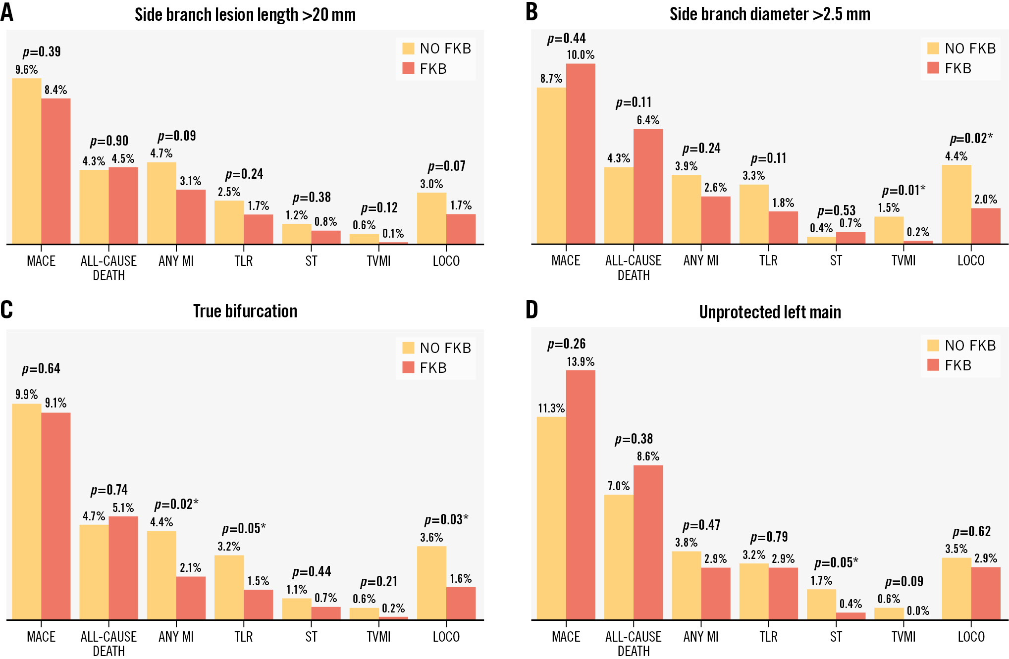 Results: A total of 5,607 patients undergoing a provisional stenting technique were selected for the present analysis. PSM generated 1,784 pairs. Between the matched patients with FKB versus no FKB, no significant difference in MACE was observed (9.0% vs 8.6%; p=0.68). FKB was associated with a lower rate of the LOCO (1.9% vs 2.9%; p=0.04) compared to the no FKB group, driven by lower rates of TVMI (0.2% vs 0.5%; p=0.03) and TLR (1.8% vs 2.6%; p=0.14). These results were confirmed in the subgroups of patients treated for bifurcations with side branches with a diameter >2.5 mm and for true coronary bifurcation lesions.