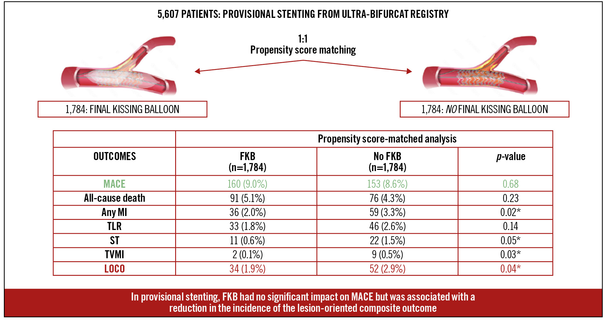 Central illustration. Final kissing balloon dilatation in patients with coronary bifurcation lesions treated with an upfront provisional stenting strategy. *Indicates statistical significance. FKB: final kissing balloon inflation; LOCO: lesion-oriented composite outcome; MACE: major adverse cardiac events; MI: myocardial infarction; ST: stent thrombosis; TLR: target lesion revascularisation; TVMI: target vessel myocardial infarction