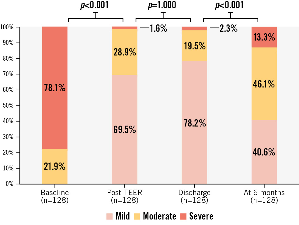 Figure 1. Changes in mitral regurgitation (MR) severity. MR was assessed at baseline (TTE or TOE), at the end of the TEER procedure (TOE), at discharge (TTE) and at six months (TOE). P-values represent the results of McNemar analysis comparing binary variables of severe versus non-severe MR. TEER: transcatheter edge-to-edge repair; TOE: transoesophageal echocardiography; TTE: transthoracic echocardiography