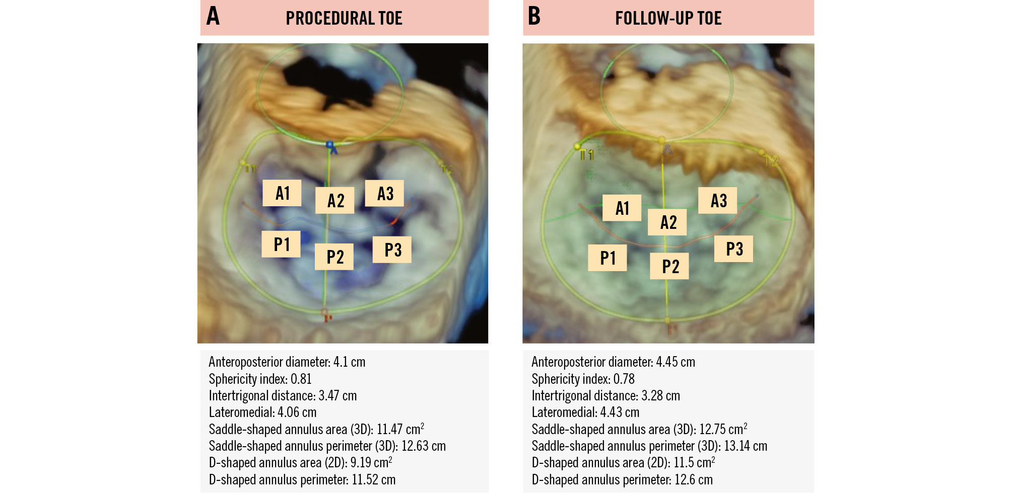 Figure 2. Procedural and follow-up TOE of the mitral valve in the same patient. Three-dimensional (3D) echocardiograms of the mitral valve were obtained from the same patient at 2 timepoints: (A) at the end of the medical procedure (procedural TOE) and (B) at 6-month follow-up (follow-up TOE), along with corresponding measurements. The results show an increase in both anteroposterior and lateromedial diameters, leading to a consecutive increase in the annular area. 2D: two-dimensional; TOE: transoesophageal echocardiography