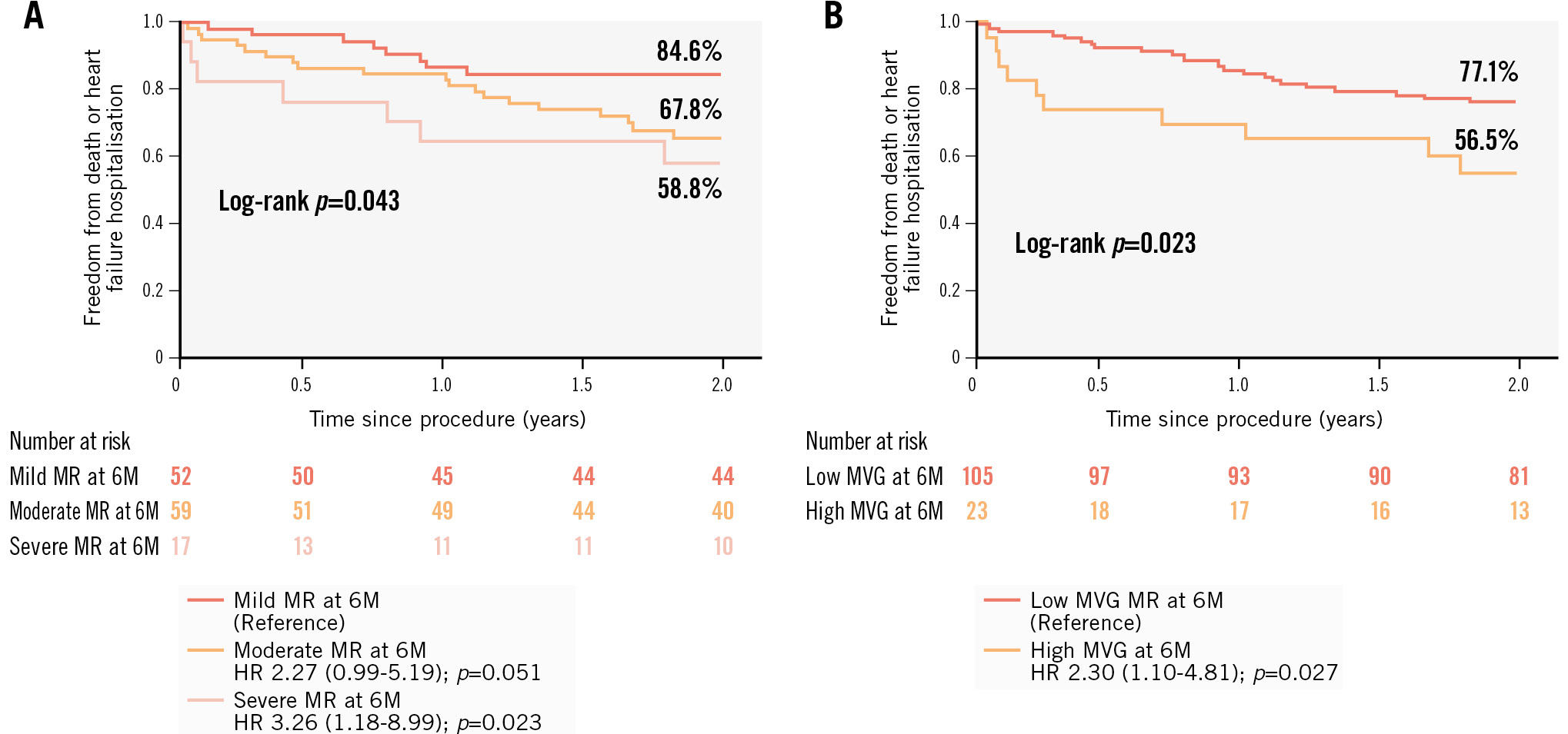 We correlated the echocardiographic parameters obtained at 6 months with clinical outcomes. The primary clinical endpoint was a composite of mortality and heart failure (HF) rehospitalisation at 2 years. Endpoints were defined according to Mitral Valve Academic Research Consortium (MVARC) criteria.