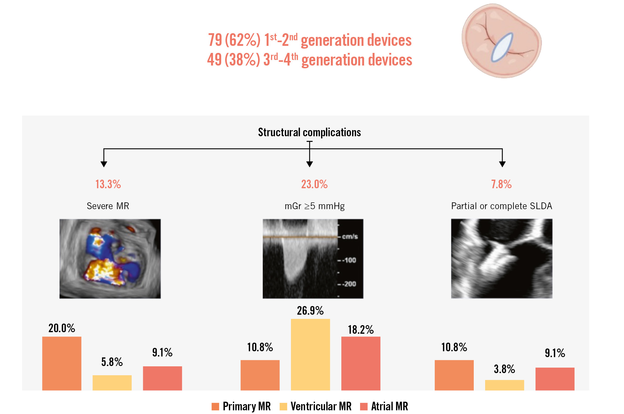 Central illustration. TOE follow-up at 6 months after M-TEER. mGr: mean gradient; MR: mitral regurgitation; M-TEER: mitral transcatheter edge-to-edge repair; SLDA: single leaflet device attachment; TOE: transoesophageal echocardiography