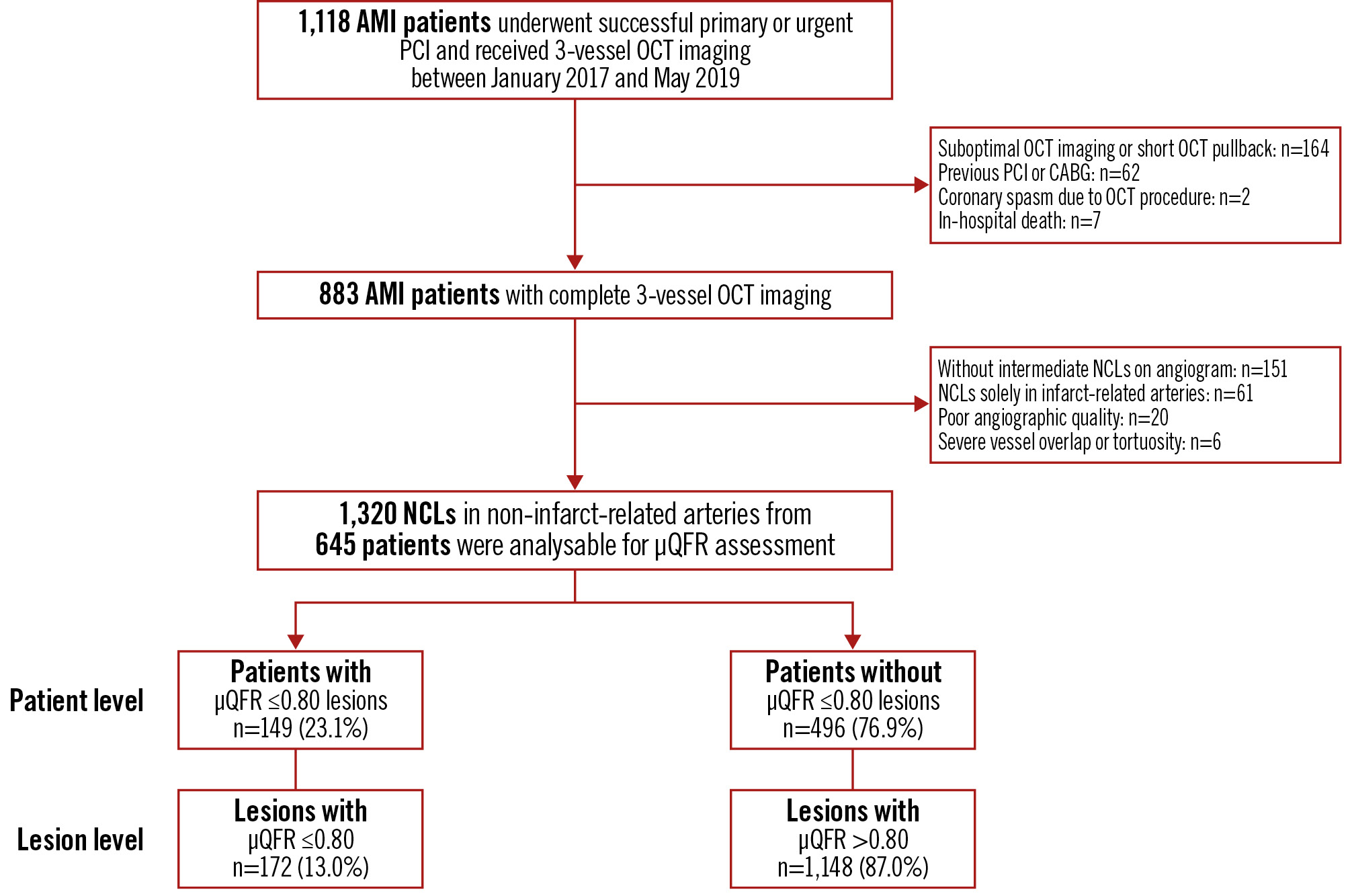 Figure 1. Study flowchart. In this study, the full analysis set included 645 AMI patients, encompassing a total of 1,320 NCLs. Among these, 149 patients (23.1%) were identified, with 172 NCLs between them (13.0%) having a μQFR ≤0.80, and the remaining 496 patients (76.9%) presented with NCLs all exhibiting a μQFR >0.80. μQFR: Murray fractal law-based quantitative flow ratio; AMI: acute myocardial infarction; CABG: coronary artery bypass grafting; NCL: non-culprit lesion; OCT: optical coherence tomography; PCI: percutaneous coronary intervention