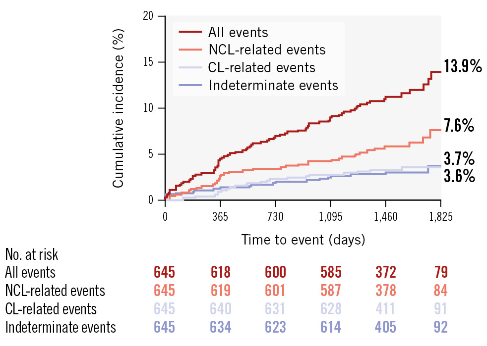 Figure 2. Longitudinal Kaplan-Meier curves for adverse cardiac events incidence. Among the 645 patients, the Kaplan-Meier curves indicate that the highest cumulative incidence of adverse cardiac events was observed for NCL-related events (7.6%). This was followed by indeterminate events (3.7%) and CL-related events (3.6%). CL: culprit lesion; NCL: non-culprit lesion