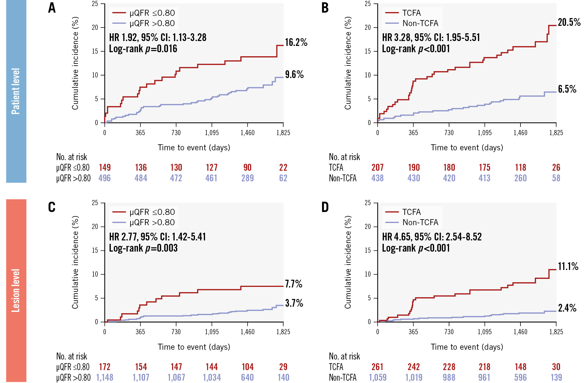 Results: The primary endpoint occurred in 59 patients (11.1%). OCT-defined TCFA independently predicted patient-level (adjusted hazard ratio [HR] 3.05, 95% confidence interval [CI]: 1.80-5.19) and NCL-specific primary endpoints (adjusted HR 4.46, 95% CI: 2.33-8.56). The highest event rate of 29.6% was observed in patients with NCLs that were TCFA (+) with μQFR ≤0.80, compared to 16.3% in those that were also TCFA (+) but with μQFR>0.80, 6.0% in those that were TCFA (–) with μQFR ≤0.80, and 6.6% in those that were TCFA (–) with μQFR>0.80 (log-rank p<0.001). TCFA was an independent predictor for the primary endpoint in ST-segment elevation MI (STEMI; adjusted HR 3.27, 95% CI: 1.67-6.41) and non-STEMI (adjusted HR 3.26, 95% CI: 1.24-8.54) patients, whereas μQFR ≤0.80 was not.