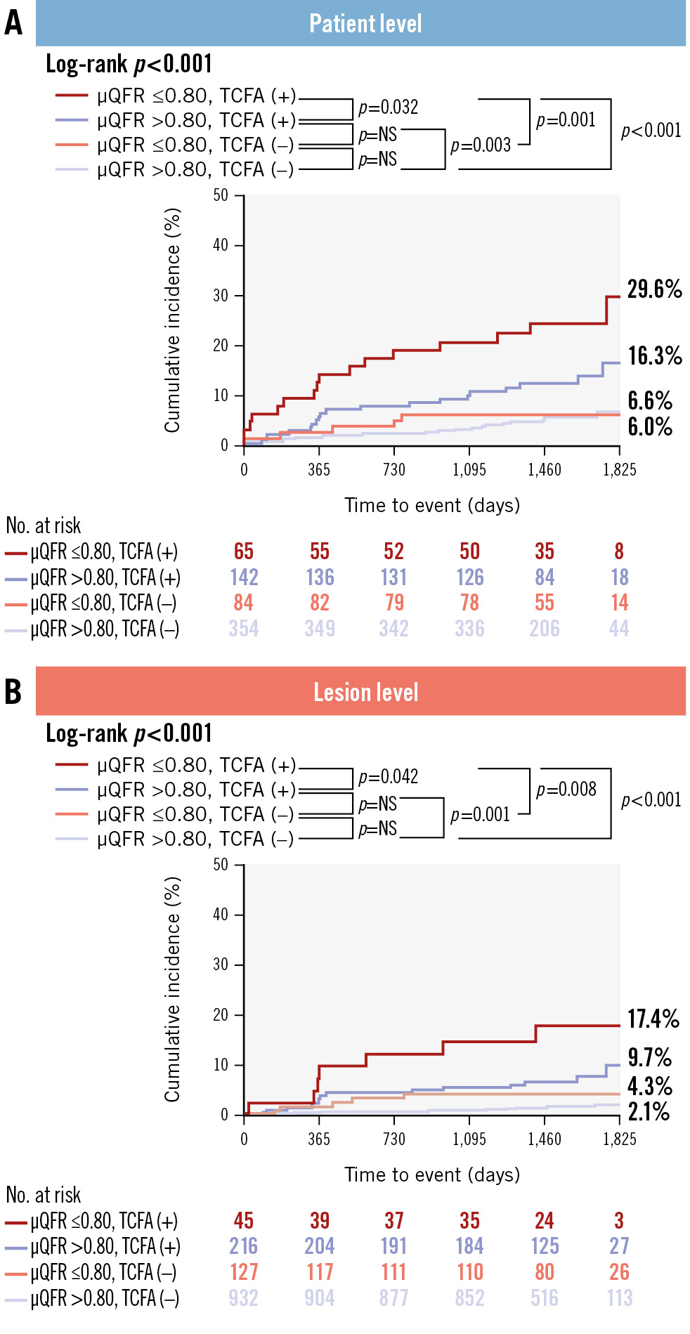 Figure 4. Combined prognostic value of μQFR and OCT-defined TCFA in patient-level and lesion-level analyses. A significant difference in the risk of NCL-related clinical events was observed when categorising (A) patients and (B) lesions into four groups based on μQFR values and the presence or absence of TCFA. μQFR: Murray fractal law-based quantitative flow ratio; NS: non-significant; OCT: optical coherence tomography; TCFA: thin-cap fibroatheroma