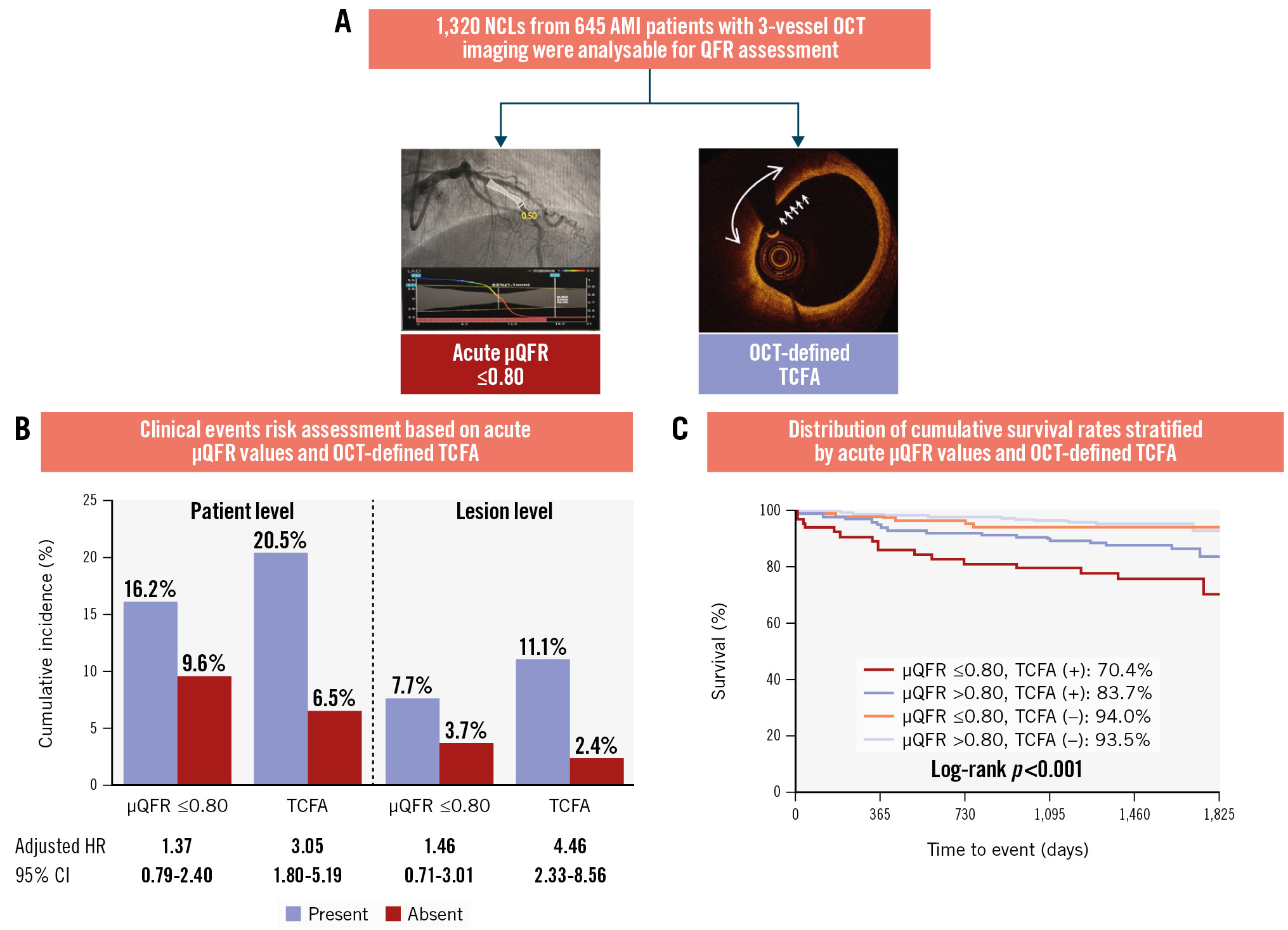 Central illustration. OCT-defined NCL TCFA demonstrates superior prognostic value compared to μQFR-determined functional significance A) Optical coherence tomography (OCT) examination and Murray fractal law-based quantitative flow ratio (μQFR) assessment were systematically conducted on a total of 1,320 non-culprit lesions (NCLs) from 645 patients with acute myocardial infarction (AMI), with a median follow-up period of 4.1 years (IQR 3.7-4.7). During the index procedure, OCT-defined thin-cap fibroatheroma (TCFA) demonstrated a dominant prognostic value for patient-level and lesion-specific adverse clinical events related to NCLs, whereas the μQFR-determined functional significance was insignificant. B) Clinical events risk assessment and (C) the cumulative survival rates. CI: confidence interval; HR: hazard ratio; IQR: interquartile range