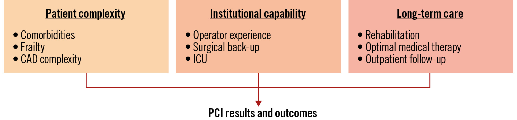 Figure 1. Patient and institutional factors influencing PCI outcomes. In addition to reduced ejection fraction, patient complexity − such as the presence of other significant comorbidities, remaining myocardial viability and overall frailty − critically influences both surgical risk and PCI risk. Once patients are classified as having high perioperative risk, coronary artery disease (CAD) complexity together with coexistent peripheral and/or valvular disease increase the interventional challenge. This must be matched by general institutional capabilities, including the availability of mechanical circulatory support and intensive care unit (ICU) expertise, and individual levels of competence in procedural skills, including knowledge, behaviour and attitudes for adequate surgical back-up and bailout situations. For long-term care, cardiovascular rehabilitation, adherence to optimal medical therapy and dedicated follow-up in a specialised outpatient setting are required. PCI: percutaneous coronary intervention
