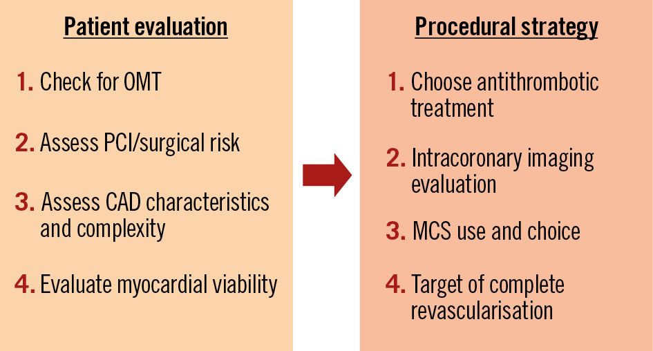 Figure 2. Stepwise clinical decision-making for high-risk PCI in patients with reduced left ventricular ejection fraction. Decision-making includes patient evaluation and procedural strategies in heart failure patients with reduced left ventricular function requiring revascularisation while being at increased risk for bypass surgery. CAD: coronary artery disease; MCS: mechanical circulatory support; OMT: optimal medical therapy; PCI: percutaneous coronary intervention