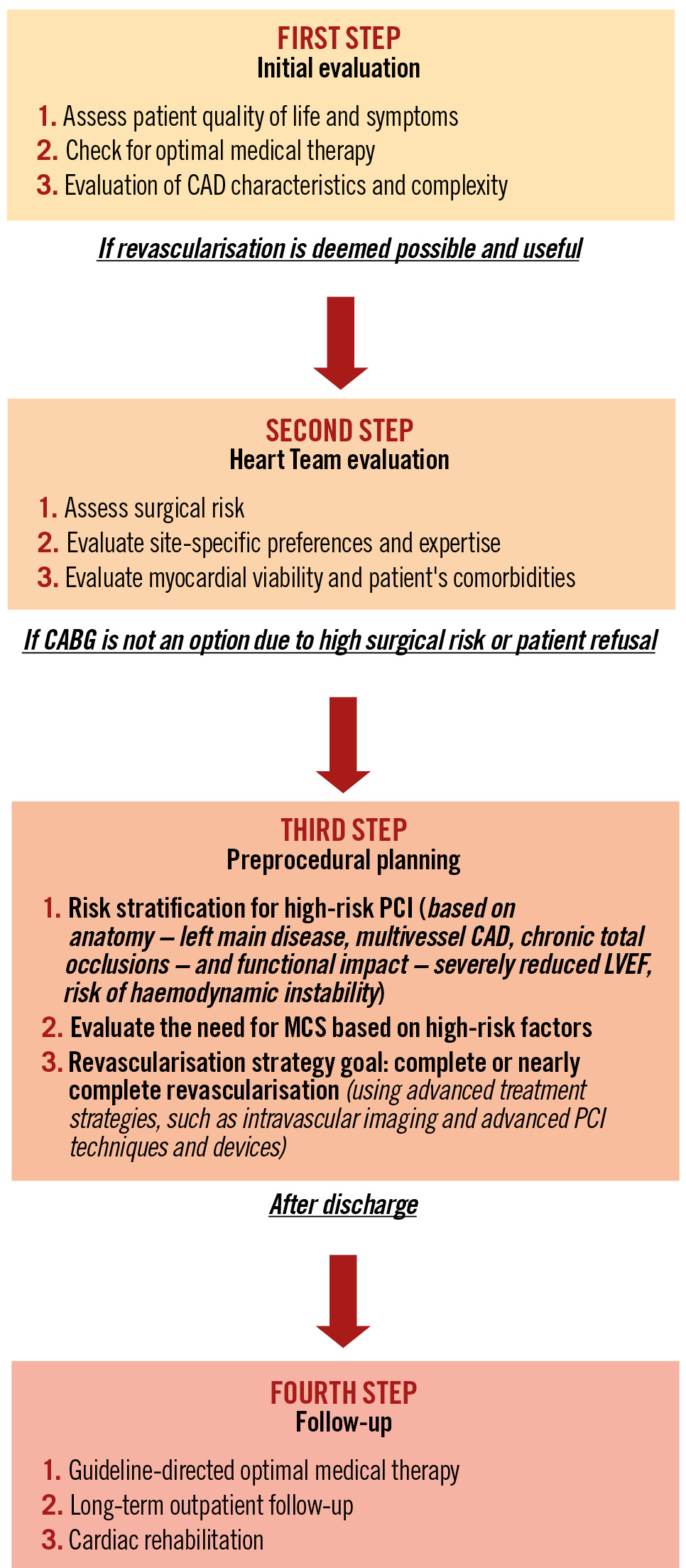 A multidisciplinary decision-making process by interÂventional cardiologists, cardiac surgeons, anaesthetists and non-invasive physicians with expertise in HF management and intensive care will be discussed within the consensus statement to evaluate the pros and cons of high-risk PCI. This is of high importance, since data are limited or non-existing on (1) any patient benefit from revascularisation, (2) patient benefit from additional mechanical circulatory support (MCS) during revascularisation, and (3) post-PCI care of this high-risk cohort.
