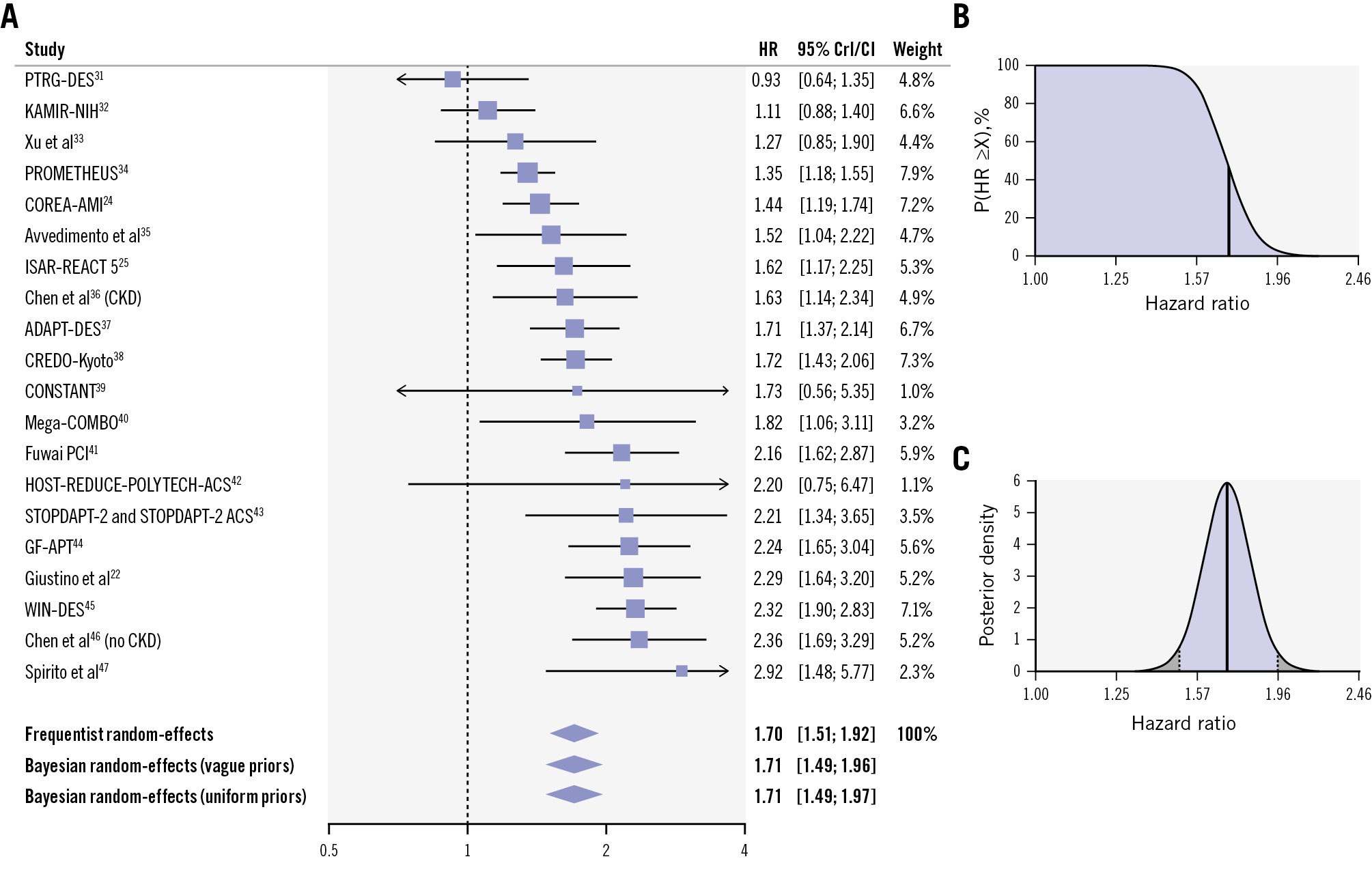 A total of 19 studies, including 150,213 participants, of whom 57,626 underwent complex PCI, contributed to the analysis of myocardial infarction. Using a Bayesian random-effects model with vague priors, patients undergoing complex PCI had a higher risk of myocardial infarction (adjusted HR 1.71, 95% CrI: 1.49-1.96; moderate to substantial heterogeneity [τ=0.24, I2=70%]; high certainty). We found a 99.9% posterior probability that complex PCI was associated with an increased risk of myocardial infarction (Figure 1). These findings were consistent when using uninformative priors and a frequentist approach (Figure 1A).