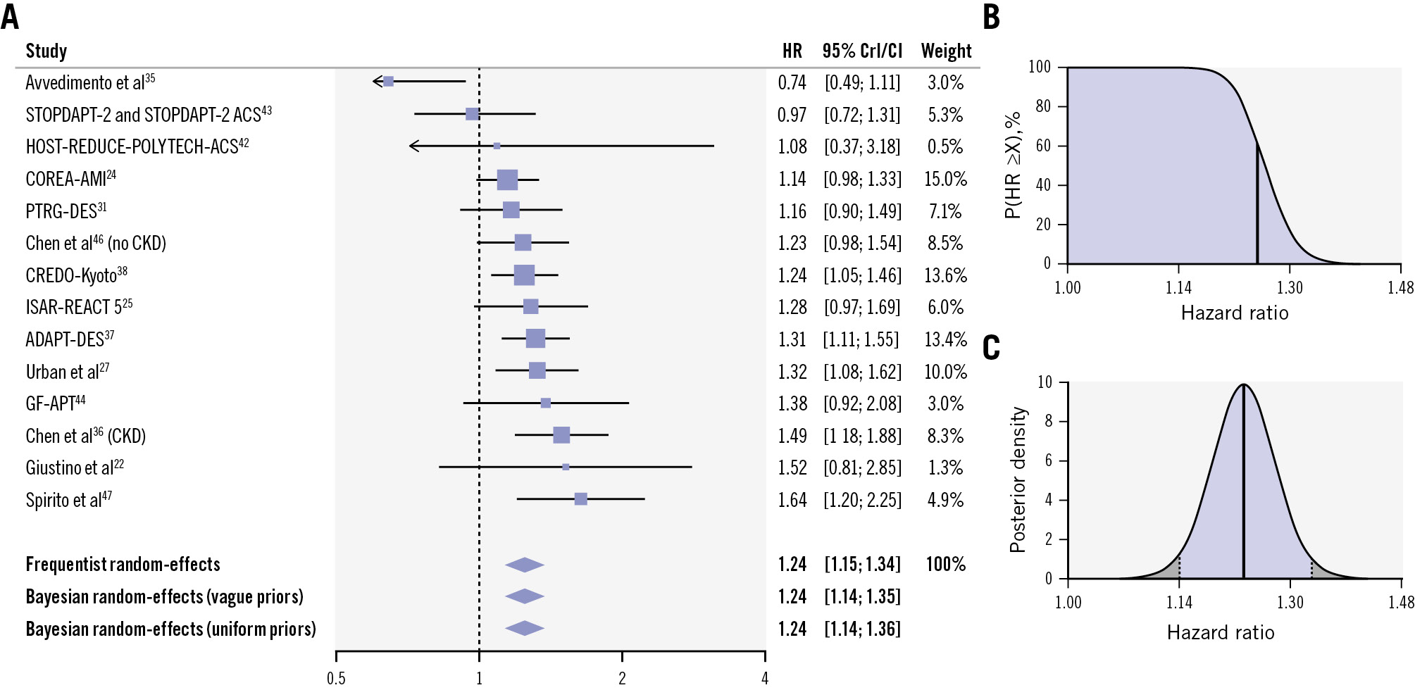 Data from 13 studies, comprising 101,096 patients, of whom 33,740 underwent complex PCI, were analysed. Using a Bayesian random-effects model with vague priors, patients undergoing complex PCI had a higher risk of major bleeding compared with those undergoing non-complex PCI (adjusted HR 1.24, 95% CrI: 1.14-1.35; low heterogeneity [τ=0.08, I2=24%]; high certainty). There was a 99.9% posterior probability that complex PCI was associated with an increased risk of major bleeding (Figure 2). Findings were consistent when using uninformative priors and a frequentist model (Figure 2A).