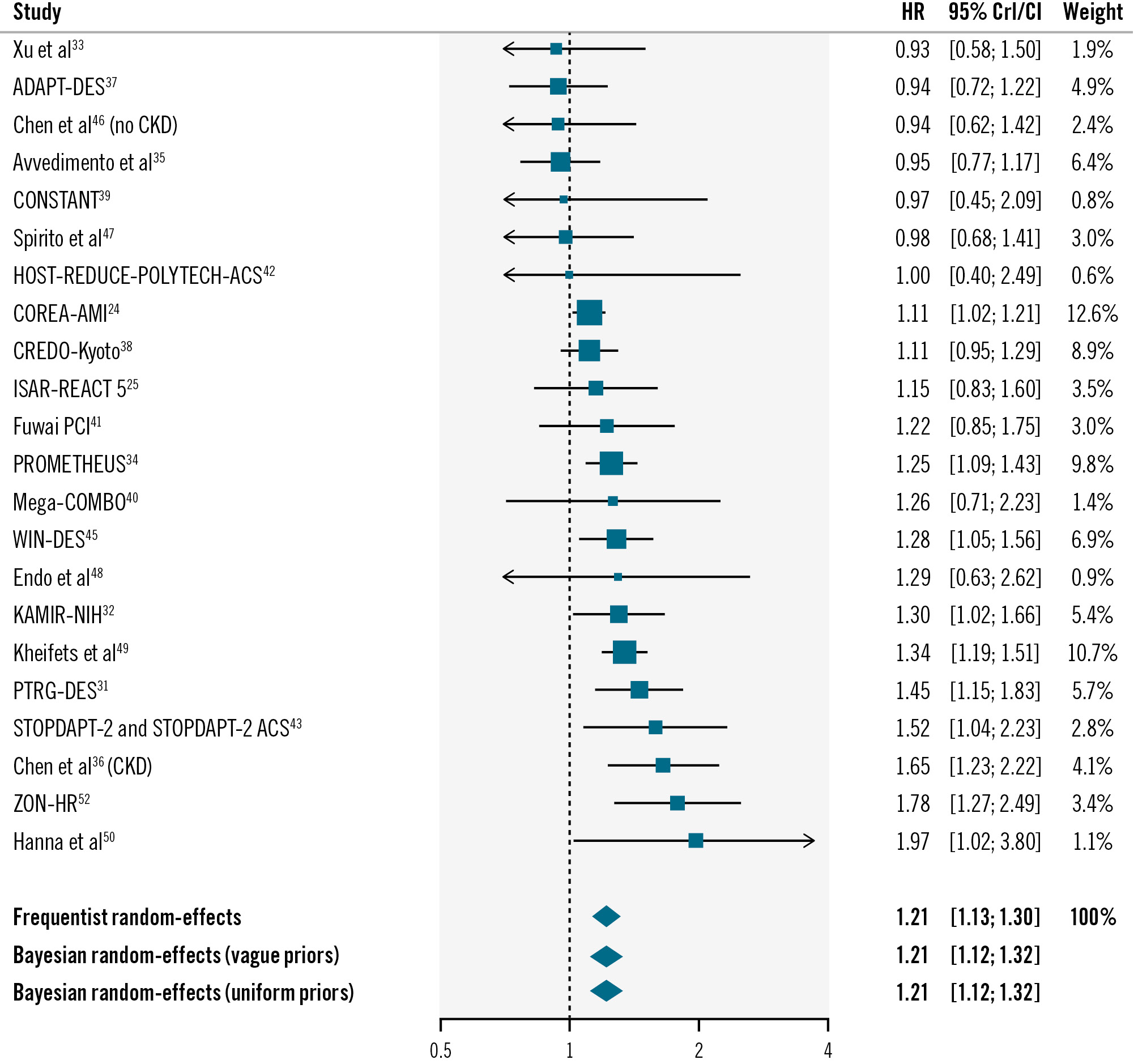 A total of 21 studies, including 150,744 patients, of whom 56,746 underwent complex PCI, contributed to the analysis of all-cause death. The risk of all-cause death was higher in patients undergoing complex versus non-complex PCI (adjusted HR 1.21, 95% CrI: 1.12-1.32; moderate heterogeneity [τ=0.12, I2=43%]; moderate certainty), with a 99.9% posterior probability (Figure 3, Supplementary Figure 2). Results were confirmed using uninformative priors and a frequentist model (Figure 3).