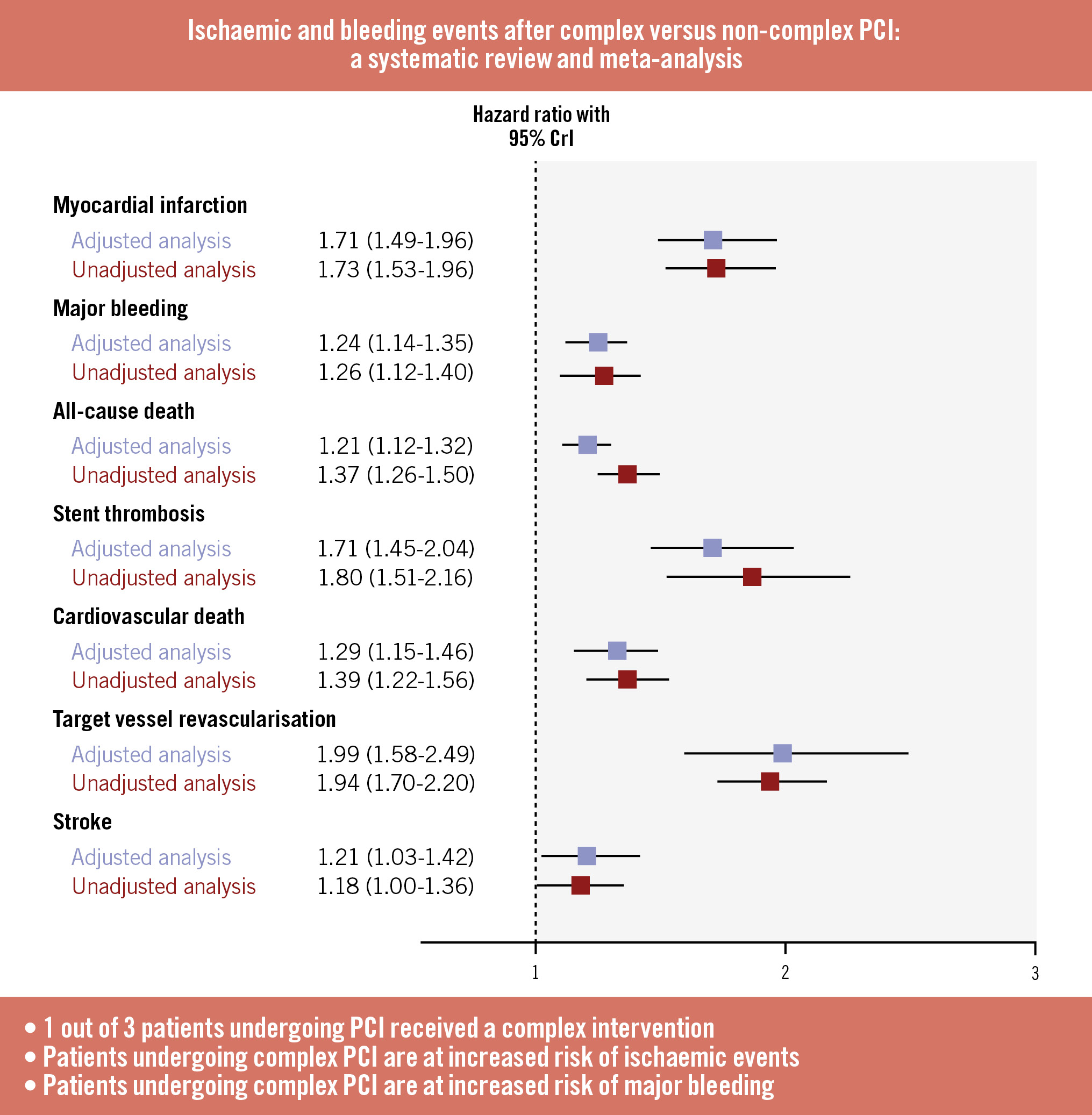 Results: We included 290,039 patients, of whom 94,633 (33%) underwent complex PCI. Compared with non-complex PCI, patients undergoing complex PCI had a higher risk of myocardial infarction (adjusted HR 1.71, 95% credible interval [CrI]: 1.49-1.96), major bleeding (adjusted HR 1.24, 95% CrI: 1.14-1.35), all-cause death (adjusted HR 1.21, 95% CrI: 1.12-1.32), cardiovascular death (adjusted HR 1.29, 95% CrI: 1.15-1.46), stent thrombosis (adjusted HR 1.76, 95% CrI: 1.49-2.14), target lesion or vessel revascularisation (adjusted HR 1.99, 95% CrI: 1.58-2.50), and stroke (adjusted HR 1.21, 95% CrI: 1.03-1.42). The posterior probability of a higher risk associated with complex versus non-complex PCI was >99% for all study outcomes. Except for stroke (which was low certainty), the certainty of evidence was moderate to high for all other outcomes. Secondary analysis, including unadjusted risk estimates, provided consistent results.