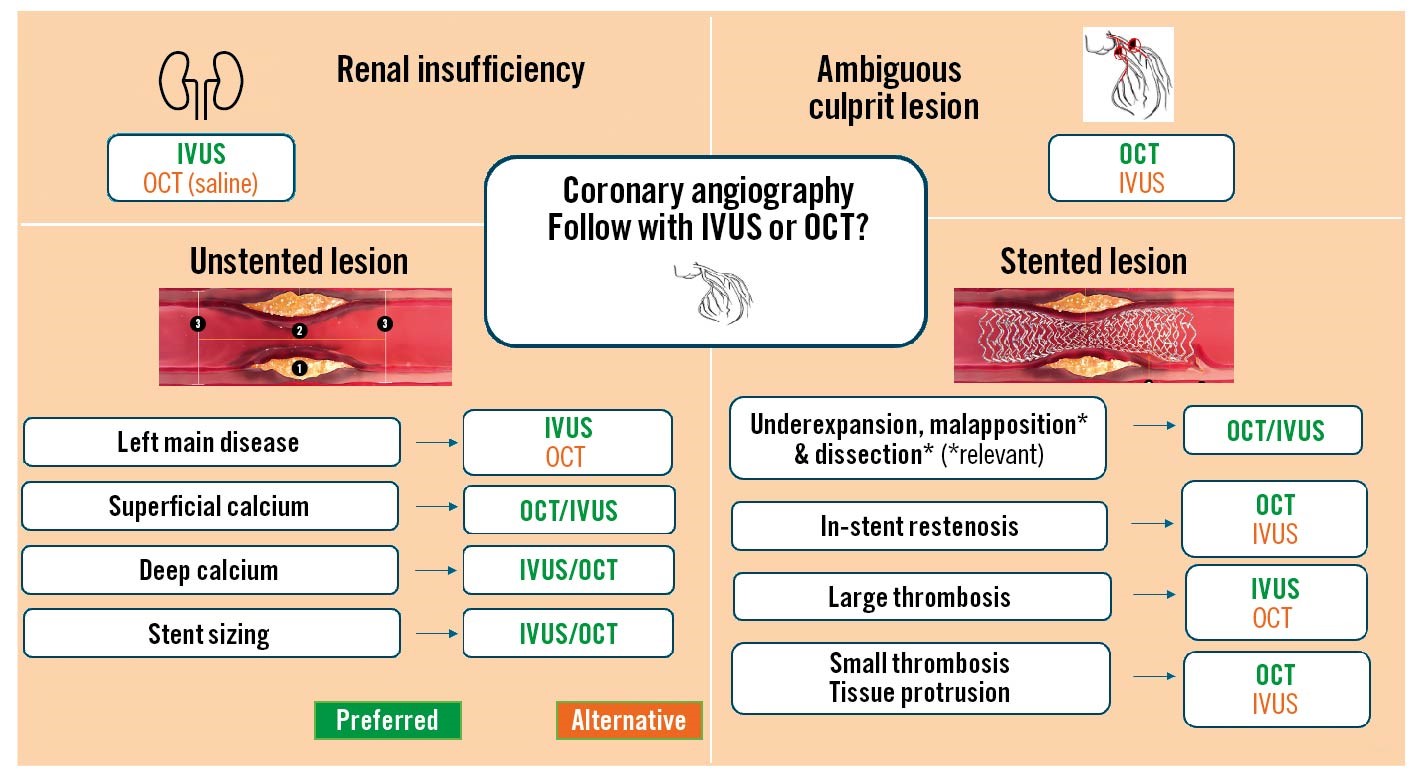 Figure 1. Clinical and morphology-based intravascular imaging selection. Intravascular ultrasound (IVUS) and optical coherence tomography (OCT) are often used to evaluate patients with renal insufficiency (upper left); since IVUS does not require contrast use, it is shown as the preferred option (green). Guidelines assigned OCT a Class IIb indication in patients with ambiguous culprit lesions (upper right). In non-stented lesions, the indication for IVUS is Class IIb9 for evaluating left main disease and, therefore, shown in green; OCT is a good alternative in this setting. IVUS is better at characterising deep calcium, but OCT can fully evaluate superficial calcium, as it often portrays the complete area and thickness (unlike IVUS, which only provides the arc of calcium). For stent sizing, there are several options: for the method that uses the diameter of the external elastic membrane, IVUS is better because of its excellent penetration; yet, for the options in which lumen diameters are used, lumen dimensions are readily and quickly available with OCT and, therefore, equivalent to IVUS. The stented lesion evaluation is also illustrated for relevant malapposition (>0.4 mm) and dissections (>60 degrees); both imaging modalities provide reasonably equivalent information, as is true for the detection of underexpansion. For in-stent restenosis, the neointima with lipid or early calcification is better evaluated with OCT. Lastly, in the presence of a large (flow-limiting) thrombus, IVUS provides good insight, but OCT is preferred for smaller thrombi and tissue protrusion because of its high resolution.
