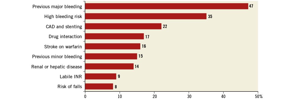 Figure 2. Indications for LAAO (for some patients >1 indication was reported). CAD: coronary artery disease; INR: international normalised ratio