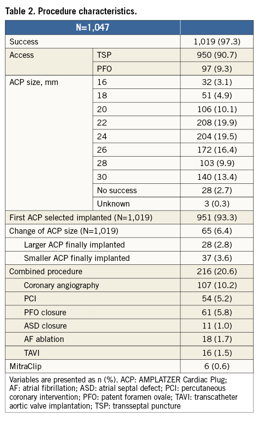 Procedural success was achieved in 1,019/1,047 patients (97.3%) (Table 2). In 950 patients (90.7%) a transseptal puncture was used; in the remaining patients the ACP was delivered through a patent foramen ovale. The most commonly used ACP device sizes were 22 mm and 24 mm. In 951 patients (93.3%) the first ACP device tried was the final implanted device. The final implanted devices were a larger device in 28 (2.8%) and a smaller device in 37 (3.6%) patients. In 216 patients (20.6%), LAAO was combined with another procedure, most commonly coronary angiography (Table 2).