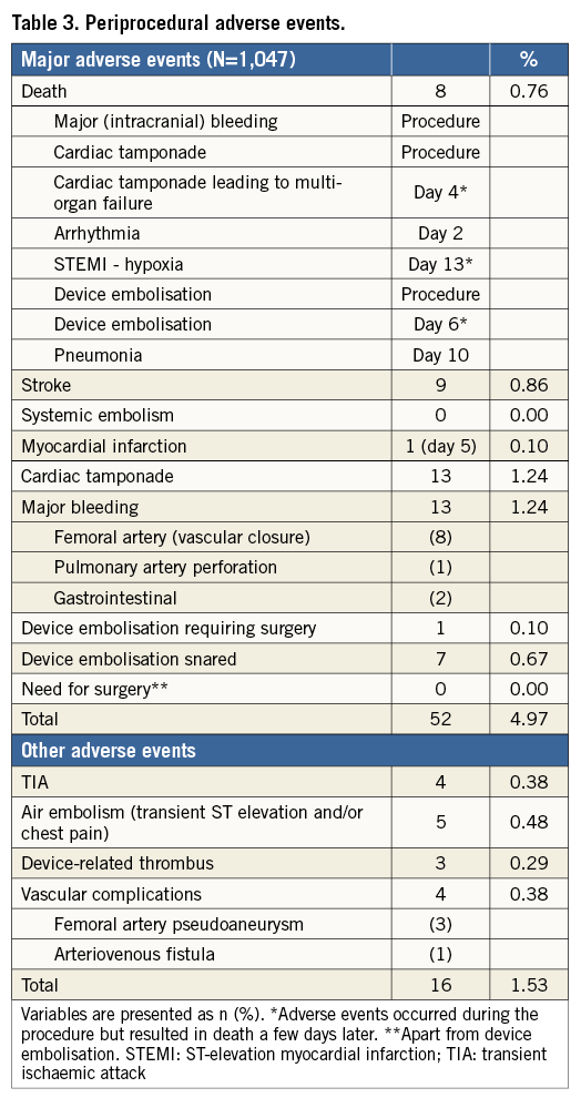 Reporting of periprocedural adverse events (occurring during zero-seven days post procedure or before hospital discharge, whichever was latest) was based on the VARC criteria11 and included death, myocardial infarction, stroke, transient ischaemic attack (TIA), systemic embolisation, air embolisation, device embolisation, significant pericardial effusion or cardiac tamponade, and major bleeding (requiring surgery or transfusion). The definition of major adverse events (MAEs) was the following: acute (zero-seven days) occurrence of death, stroke (ischaemic or haemorrhagic), systemic embolism and procedure or device-related complications requiring major cardiovascular or endovascular intervention. This definition was used in order to be able to compare the study results with previous reports3.