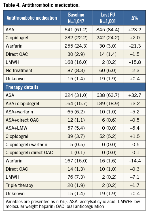 Clinical follow-up included all implanted patients and was carried out by patient visits or phone contact, per centre or operator protocol. Reporting of adverse events during follow-up was based on the VARC criteria11 and included death (cardiovascular or non-cardiovascular), stroke, TIA, systemic embolism, and major bleeding. All centres provided a summary for every reported major adverse event. Antithrombotic medication was recorded at the admission date, and at last follow-up visit. The recommendation by the device manufacturer following LAAO was to prescribe acetylsalicylic acid (ASA) 80-100 mg and clopidogrel 75 mg daily for one to three months and then only ASA 80-100 mg for at least another three months. However, the choice and the duration of antithrombotic therapy were individualised depending on the patient history, indication for LAAO, and physician preference.