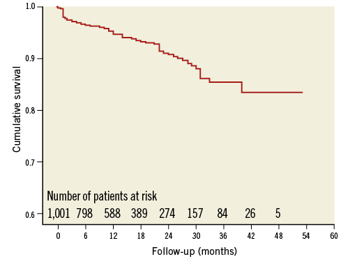 Clinical follow-up was complete in 1,001/1,019 of successfully implanted patients (98.2%). Average follow-up was 13 months (IQ range six-25 months), resulting in a total of 1,349 patient-years. Table 4 summarises the changes in antithrombotic medication between baseline and last follow-up. ASA monotherapy increased from 31% to 64%, and warfarin (or phenprocoumon) monotherapy decreased from 16% to 1.6%. The average duration of dual antiplatelet therapy was 3.8 months. One-year all-cause mortality was 4.3% (Figure 3). A total of 63 deaths was reported at follow-up (17 due to cardiovascular causes). None was reported as being related to the device. There were nine strokes (0.9%) and nine TIAs (0.9%) at follow-up. The mean CHA2DS2-VASc score of the 1,001 successfully implanted patients with complete follow-up was 4.4±1.6 (annual risk for thromboembolism 5.6%). The annual rate of systemic thromboembolism in the study (periprocedural and follow-up) was 2.3% (31/1,349 patient-years), which translates into a 59.1% risk reduction (Figure 4). There were 15 major bleedings (1.5%) at follow-up. The mean HAS-BLED score of the 1,001 successfully implanted patients with complete follow-up was 3.1±1.2 (annual risk for bleeding 5.3%). The annual rate of major bleeding in the study (periprocedural and follow-up) was 2.1% (28/1,349 patient-years), which is a 61.0% risk reduction (Figure 4).