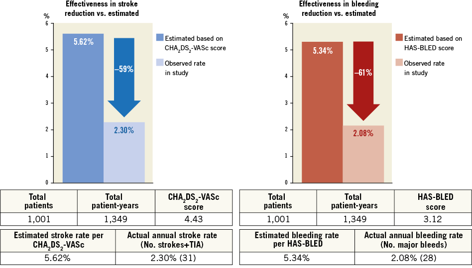 Methods and results: Data from consecutive patients treated in 22 centres were collected. A total of 1,047 patients were included in the study. Procedural success was 97.3%. There were 52 (4.97%) periprocedural major adverse events. Follow-up was complete in 1,001/1,019 (98.2%) of successfully implanted patients (average 13 months, total 1,349 patient-years). One-year all-cause mortality was 4.2%. No death at follow-up was reported as device-related. There were nine strokes (0.9%) and nine transient ischaemic attacks (0.9%) during follow-up. The annual rate of systemic thromboembolism was 2.3% (31/1,349 patient-years), which is a 59% risk reduction. There were 15 major bleedings (1.5%) during follow-up. The annual rate of major bleeding was 2.1% (28/1,349 patient-years), which is a 61% risk reduction. Patients with single LAAO on aspirin monotherapy or no therapy and longer follow-up had fewer cerebral and fewer bleeding events.