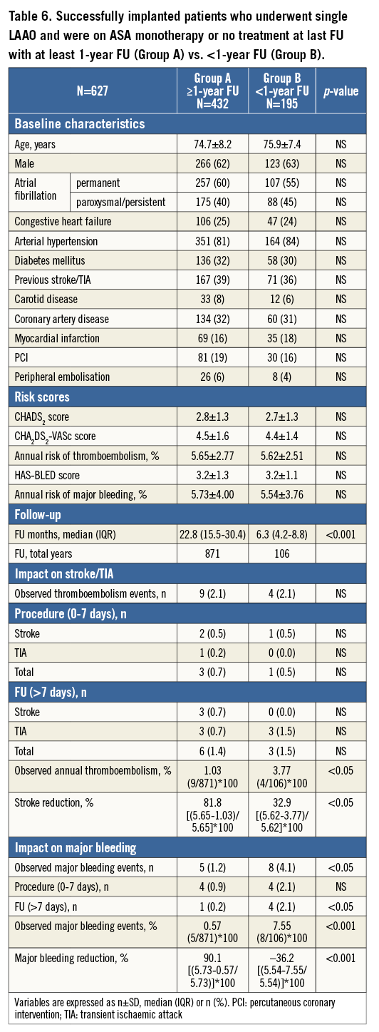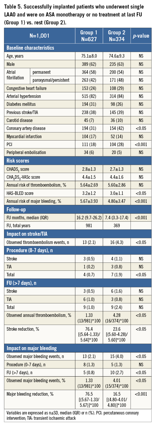Patients who received ASA monotherapy or no treatment at last follow-up after a successful lone LAAO procedure (Group 1, n=627) were compared to the other patients (Group 2, n=374) (Table 5). Baseline characteristics were similar between groups, with the exception of history of coronary artery disease and previous stenting which was more frequent in Group 2. Although the stroke risk was similar, there were more periprocedural strokes in Group 2, so the overall stroke risk reduction was higher for Group 1 (74.6% vs. 23.6%, p<0.05). With respect to major bleeding, periprocedural events were similar, but Group 2 had more bleedings at follow-up despite the relatively lower HAS-BLED score. Therefore, major bleeding reduction was significantly higher for Group 1 (76.5% vs. 16.5%, p<0.001).