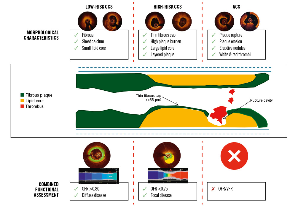IC imaging technologies have supported an evolution in our understanding of coronary atherosclerosis that may be reliably applied to inform lesion stratification and guide clinical care. Histological study established that a thin-cap fibroatheroma (TCFA), with evidence of cholesterol crystal deposition, a large necrotic core, neovascularisation, and immune cell infiltration, represents the highest clinical risk lesion and is commonly referred to as a “vulnerable” plaque424.