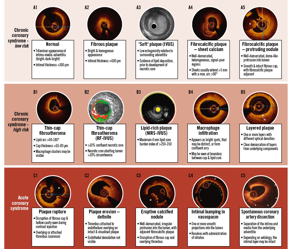 | *RF-IVUS defined TCFA: ≥10% confluent necrotic core with >30° abutting the lumen in three consecutive frames. #OCT defined TCFA: a lipid plaque with arc >90° and fibrous cap thickness <65 μm. ACS: acute coronary syndrome; BVS: bioabsorbable vascular scaffold; CCS: chronic coronary syndrome; DCB: drug-coated balloon; DES: drug-eluting stent; EEM: external elastic membrane; FFR: fractional flow reserve; hs-CRP: high-sensitivity C-reactive protein; IC: intracoronary; iFR: instantaneous wave-free ratio; IQR: interquartile range; IVUS: intravascular ultrasound; maxLCBI4mm: maximal lipid core burden indexed in a 4 mm segment; MI: myocardial infarction; MLA: minimum lumen area; NIRS: near-infrared spectroscopy; NSTE-ACS: non-ST-segment elevation acute coronary syndrome; OCT: optical coherence tomography; OMT: optimal medical therapy; PCI: percutaneous coronary intervention; RF: radiofrequency; SAQ: Seattle Angina Questionnaire; STEMI: ST-segment elevation myocardial infarction; TCFA: thin-cap fibroatheroma; TIA: transient ischaemic attack; TIMI: Thrombolysis in Myocardial Infarction; TLR: target lesion revascularisation; TVR: target vessel revascularisation | |||||
