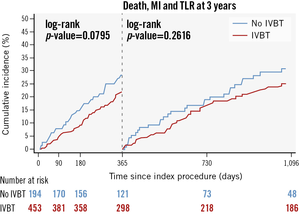 Results: A total of 647 patients (mean age 66.6±9.9 years, 25.5% female) were included: 453 patients (70%) were treated with IVBT and 194 patients (30%) with a non-IVBT strategy. Baseline characteristics were similar, except for IVBT-treated patients having a higher incidence of prior coronary artery bypass grafting. The IVBT group had a lower mean SYNTAX score (11.9±10.7 vs 14.2±11.3; p=0.028) and were significantly less likely to receive a DES (0.4% vs 25.8%; p<0.001). At 3-year follow-up, the incidence of MACE was lower in the IVBT-treated group compared to the non-IVBT group (propensity score-adjusted analysis: 39.5% vs 47.8%; hazard ratio 0.73, 95% confidence interval: 0.53-0.99; p=0.044). There were no significant differences between the incidence of the individual components of MACE in each group.