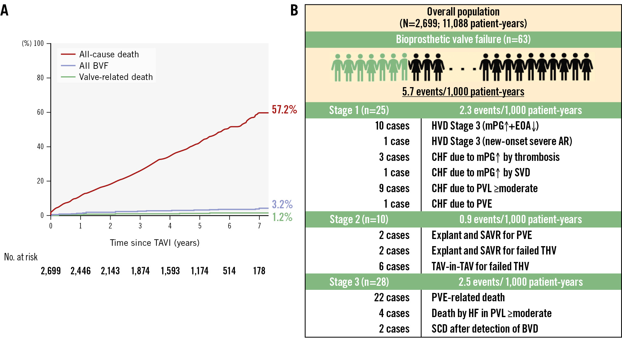 The main findings of this study are summarised as follows: (1) after TAVI with a BE-THV, the 7-year mortality rate was 57.2%, the incidence of BVF was 3.2%, and BVF-related death was observed in 1.2%. In addition to the appearance of structural valve deterioration (SVD), and the new onset of AR, the involvement of PVE was confirmed in one-third of the BVF cases. 2) In TAVI using a BE-THV, multivariable analysis showed no significant differences between the SAA and LAA groups in terms of HF events or all-cause mortality. Additionally, the incidence of BVF did not differ between the groups based on the person-year method (5.6 events/1,000 patient-years vs 5.9 events/1,000 patient-years; p=0.80) or Gray’s test (3.3% vs 2.7%; p=0.83). 3) The SAA group had a higher incidence of severe PPM and mPG ≥20 mmHg after TAVI compared to the LAA group. However, these factors were not identified as predictive factors of late prognosis or BVF in the entire cohort. Even when focusing on the data separately by sex, a lack of association was consistently observed between the sex difference and long-term outcomes, HF hospitalisation, and BVF. As TAVI indications continue to expand, one of the key remaining challenges is clarifying long-term durability of THVs, including SVD. The absence of sufficient durability data has led to different age-based guidelines worldwide. In Europe, the cutoff age for TAVI and surgical aortic valve replacement (SAVR) candidates is clearly set at 75 years, while in Japan, the 75-80 age range is considered a grey zone1112. The United States has adopted a broader approach, defining the entire 65-80 age range as a grey zone for considering both TAVI and SAVR indications13. In the context of lifetime management for AS patients, it is crucial to consider differences in life expectancy across racial groups. Japanese individuals, who are known for their longevity, have notably higher life expectancies. According to Japan’s national census, an 85-year-old male typically has around 6 more years to live, while a female of the same age has about 8 years. In this study cohort, males with an average age of 83.8 years had a 7-year cumulative mortality rate of 64.2%, while females with an average age of 84.7 years had a rate of 52.7%. Although these patients received TAVI, their survival was markedly worse than that of the general population. These results highlight that even in Japan, where life expectancy is among the longest in the world, the poor long-term outcomes support the appropriateness of the current age thresholds for TAVI set by different countries. Although THV durability remains a key issue, the fact that BVF-related mortality is approximately 1% suggests that a broader perspective is needed to identify more effective strategies for improving long-term outcomes in elderly AS patients. Recent discussions have increasingly focused on the variation in THV postoperative haemodynamics, as evaluated by echocardiography, based on a patient’s aortic annulus size. In patients following SAVR, previous studies have reported that an SAA is associated with inferior outcomes, haemodynamic limitations, and an elevated risk of PPM1415. In fact, in this study, an increase in mPG, an mPG ≥20 mmHg, and severe PPM were all more prevalent in the SAA group compared to the LAA group. It is evident that a larger annulus size facilitates the implantation of a bigger THV, which results in favourable postoperative haemodynamic outcomes. Numerous studies, transcending racial differences in body sizes, have shown that patients with SAA tend to have an elevated mPG and a higher frequency of PPM after TAVI using BE-THVs compared to those using SE-THVs3456. However, the prognostic implications of these findings regarding annulus size differences, as well as mPG elevation and PPM, are still controversial and remain under debate1617181920. In this study, the proportion of females in the SAA group was 84.6%, while the proportion of females in the LAA group decreased to 31.1%. A key aspect in the discussion of annular size is the consideration of the patient’s body size, and therefore, an additional analysis was conducted to investigate sex differences separately. Indeed, there was a significant interaction between sex and SAA-LAA status in relation to long-term prognosis. Nevertheless, differences in annulus size did not show any impact on long-term prognosis or BVF in both the male and female groups. Particularly in patients receiving a BE-THV, the mPG elevation showed no correlation with prognosis21. Moreover, the prognosis for those implanted with the exceptionally small 20 mm bioprosthetic valve was similar to that for other larger valve sizes, as reported in both Japan and Western countries2223. The finding of prior evidence, including the recent subanalysis of the RCTs, demonstrated comparable 5-year clinical outcomes between patients with SAA and LAA treated with BE-THVs8. Together, these results suggest that with appropriate valve sizing and implantation strategies, a smaller annulus size does not inherently confer worse long-term outcomes. In line with this, our study also found no significant association between annular size and the risk of subsequent HF. The current study further supports this notion in a real-world cohort with contemporary devices and diverse patient backgrounds. On the contrary, the findings of this study show that severe PPM tends to worsen prognosis. Additionally, the large-scale OCEAN-TAVI study, which included over 7,000 patients and examined all THV types, reported that severe PPM may be associated with poor prognosis24. Given the smaller sample size in our cohort compared to previous OCEAN-TAVI data, it is possible that the current study is underpowered to detect the prognostic significance of severe PPM. Therefore, the influence of severe PPM on long-term outcomes remains an important issue that warrants further investigation in larger cohorts. In this study, BVF wa